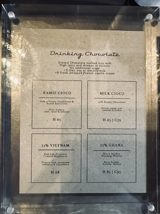 -🕌 ʀᴀᴍɪᴇ @ramie_hk ・🌛古希臘的可可、馬雅的阿茲特克.:/・✿-✿-✿-✿-✿-✿-✿-✿-✿-✿-✿・🌜 【 𝕮𝖍𝖔𝖈𝖔 𝖓 𝕮𝖍𝖔𝖈𝖔 】・🫒 ᴛᴀʀᴛᴜꜰᴏ ᴛᴀʀᴛ ʜᴋᴅ45☁️ ʀᴀᴛɪɴɢ🌕🌕🌕🌕🌑❈ 食感-喜歡巧克力餅的鬆、也喜歡開心果生乳的輕盈❈ あじ-表層的巧克力 可可香甜濃郁底層的巧克力餅乾 帶有可可烘焙香甜開心果意式生乳 不濃、不猛 卻鮮莓果醬 果酸鮮甜很明顯甚或 會遮蓋可可香甜當然開心果 更被拋諸腦後而變成配角但其實 三者有在互相襯托、變化令本體發光發亮 令層次層層遞出這是被縮小的幸福 _(´ཀ`」 -❄️ ᴍᴀᴛᴄʜᴀ ᴅɪʀᴛʏ ʜᴋᴅ60🪽 ʜᴏᴛ ᴡ/ ᴀʟᴍᴏɴᴅ ᴍɪʟᴋ☁️ ʀᴀᴛɪɴɢ🌕🌕🌕🌕🌑❈ 香り-抹茶茶甘香 沉鬱的香氣作主調❈ あじ-初段|是杏仁奶韻香甜中段|是抹跟奶在融洽、交織奶香中滲透抹甘澀 但始終仍是奶韻較重-中段接近尾聲|抹漸濃 而奶漸淡..此時 抹與奶依然和諧地相處-尾段|抹變得濃烈 濃中更帶點苦澀最後就剩下澀.. 是會上頭的澀-完滿結束 ∠( ᐛ 」∠)-👹 ᴍᴏɴᴛᴇ ᴄᴀʀʟᴏ ʜᴋᴅ52🪽 ʜᴏᴛ ᴡ/ ᴍɪʟᴋ + ᴄʀᴇᴀᴍ☁️ ʀᴀᴛɪɴɢ🌕🌕🌕🌖🌑❈ 香り-𝑒𝓈𝓅𝓇𝑒𝓈𝓈𝑜 香氣濃濃.:/-❈ あじ-濃縮微澀的 𝑒𝓈𝓅𝓇𝑒𝓈𝓈𝑜下是順滑無比的奶香甜神奇地 牛奶香中 竟充滿著咖啡苦香!而香氣比苦韻明顯 很醉人..-每口都是咖啡的甘香 夾雜著微苦澀最後一口 可以享用匙上的巧克力塊為咖啡增添一點香甜跟一點和諧感-這是一杯充滿咖啡香氣的 𝒮𝒽𝑜𝓉雖然只有一兩口 卻是滿滿的精華!!-🦇 ᴍᴏᴄʜᴀᴄᴄɪɴᴏ ʜᴋᴅ60🪽 ʜᴏᴛ ᴡ/ ᴀʟᴍᴏɴᴅ ᴍɪʟᴋ☁️ ʀᴀᴛɪɴɢ🌕🌕🌕🌗🌑❈ 香り-香濃咖啡の香氣作為主調-❈ あじ第一口以濃縮咖啡苦香作開首但更多的 會是杏仁奶奶香慢慢去感受 兩者在平衡跟了解奶韻其實稍微濃稠一點..杏仁奶奶香中滲透著苦香 是和諧可可韻在中後段才出現 不濃一直喝到尾 杏仁奶像是消失得無影無蹤..取而代之是可可 配搭咖啡甘香!-整體不苦 不澀 就只是香..-這杯我冷的 熱的都有喝過個人更喜歡熱的 ℳ𝑜𝒸𝒽𝒶𝒸𝒸𝒾𝓃𝑜-還有美美的拉花 ❀ ❀ ❀ ・✿-✿-✿-✿-✿-✿-✿-✿-✿-✿-✿・︎🔝最後附上排名 ☪︎ -> 七訪記錄🎼 ❦ > 熱飲 // ⛥ > 凍飲 //🌙 ❀ > 杏仁奶 // ❂ > 牛奶 //・🐻 ❦ ❀ 𝟩𝟩% ɢʜᴀɴᴀ〰️ 1 ᴛɪᴍᴇ🐨 ❦ ❀ 𝟦𝟣% ᴄɪᴏᴄᴏ 〰️ 2 ᴛɪᴍᴇꜱ 🍍 ❦ ❀ 𝟩𝟤% ᴠɪᴇᴛɴᴀᴍ 〰️ 1 ᴛɪᴍᴇ🍬 ❦ ❂ ʙɪᴄᴇʀɪɴ 〰️ 1 ᴛɪᴍᴇ👻 ❦ ❂ ᴍᴏɴᴛᴇ ᴄᴀʀʟᴏ 〰️ 1 ᴛɪᴍᴇ🦚 ❦ ❀ ᴍᴀᴛᴄʜᴀ ᴅɪʀᴛʏ 〰️ 1 ᴛɪᴍᴇ💌 ❦ ❀ 𝟨𝟪% ʀᴀᴍɪᴇ ᴄɪᴏᴄᴏ 〰️ 1 ᴛɪᴍᴇ🪵 ❦ ❀ 𝟩𝟫% ᴘᴀᴘᴜᴀ ɴᴇᴡ ɢᴜɪɴᴇᴀ 〰️ 1 ᴛɪᴍᴇ❄️ ⛥ ❀ 𝟦𝟣% ᴄɪᴏᴄᴏ 〰️ 1 ᴛɪᴍᴇ🐌 ❦ ❀ ᴍᴏᴄʜᴀᴄᴄɪɴᴏ 〰️ 1 ᴛɪᴍᴇ☕️ ⛥ ❀ ᴍᴏᴄʜᴀᴄᴄɪɴᴏ 〰️ 1 ᴛɪᴍᴇ・𝓣𝓸 𝓫𝓮 𝓒𝓸𝓷𝓽𝓲𝓷𝓾𝓮𝓭..・📍 ʀᴀᴍɪᴇ @ramie_hk 👉🏻 銅鑼灣告士打道275號海都大廈地下11號舖-…查看更多