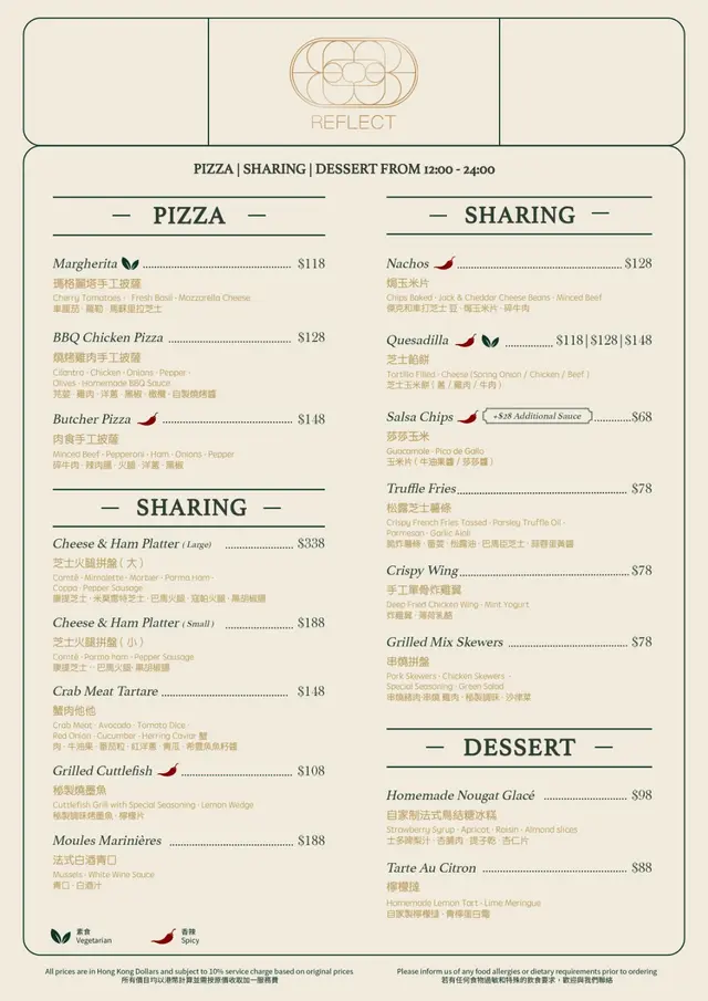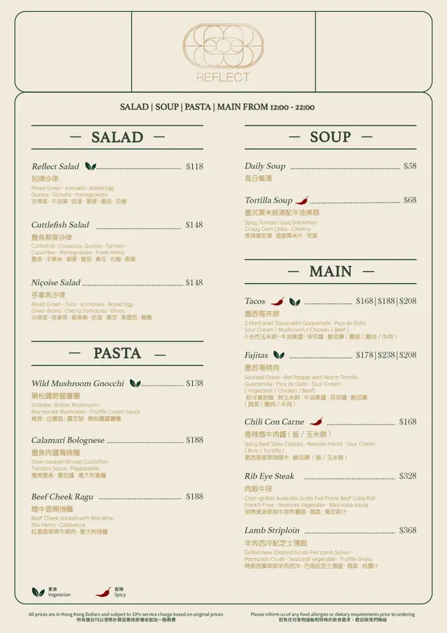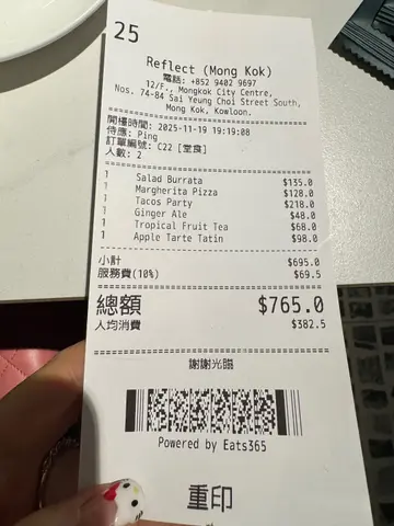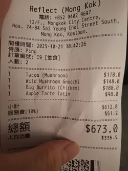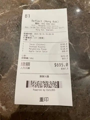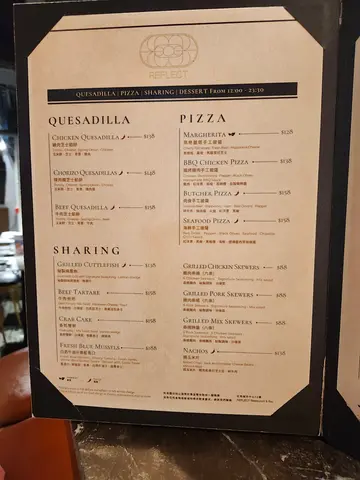 -REFLECT Restaurant & Bar -📍旺角.旺角西洋菜南街商廈嘅天台,有一間人氣高質手工墨西哥菜。當晚我哋大概七點左右到餐廳,好快餐廳就已經坐滿食客。可惜當日落住雨,所以我哋選擇咗坐室內。天台室外區應該更加有氣氛。.我哋坐咗喺吧枱位置,都唔會好迫夾,仲可以望住Bartender調配飲品。.秘製燒牛舌 ($98)牛舌厚切又大片,肉質柔軟,加埋檸檬汁,更帶出香濃牛舌鮮味。.蘑菇Tacos ($178)墨西哥菜又點少得Tacos。Taco好香脆,包住超豐富餡料,除咗滿滿的蘑菇之外,仲有洋蔥粒同牛油果蓉,加埋微辣醬汁,啖啖滿足。.肉眼牛扒 ($338)我哋點咗五成熟,廚師嘅火喉控制非常好,切開仲見到肉眼扒中間仲係粉嫩軟肉。肉眼牛扒帶點脂肪,牛味更為香濃。.反轉蘋果批 ($98)必點的甜品,同傳統的蘋果批完全不一樣。賣相已經好吸引,焗過的蘋果片非常清甜多汁,加埋肉桂粉同冰凍的雲呢拿雪糕,味道非常豐富。.Cranberry Juice ($48)Peach Juice ($48)…查看更多