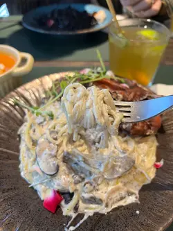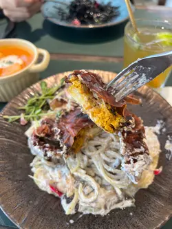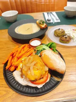 餐廳以木系裝潢,讓人感覺放鬆。菜式選擇超多,由日式沙律到南洋風味的叻沙都有。🔸日式三文魚子蕃茄他他伴芥末牛油果沙律三文魚子和蕃茄粒融合,味道清新,沙律菜配芥末醬,微辣開胃。🔸香煎蟹肉餅伴黑蒜蛋黃醬法式雷穆拉德醬芹菜頭青蘋果沙律蟹餅外表焦香,裏面的蟹肉和薯蓉打得綿滑。配搭清爽的青蘋果沙律,味道不錯。🔸芝士澳洲和牛漢堡伴焦糖洋蔥·田園沙律·炸甜蕃薯條·松露醬麵包鬆軟帶有牛油香,和牛漢堡係7成熟,質地頗嫩,肉汁豐富,加入牛油果,口感順滑。炸蕃薯條脆口,唔油膩。🔸椰香叻沙汁煮手工幼管意粉配香茅牛油焗波士頓龍蝦叻沙汁濃厚郁,味道似冬陰功汁,每條幼管意粉都掛滿醬汁,味道香辣。龍蝦肉質彈牙,有香茅的香味。🔸抹茶奶蓋椰子水抹茶的茶味溫和,奶蓋帶有微鹹,椰子水較清淡。🔸Hojicha Latte焙茶和奶融合,味道濃淡適中。…查看更多