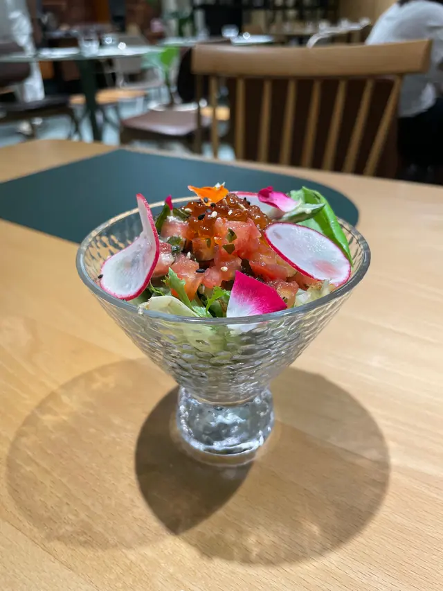 呢間工廈嘅Cafe有精緻嘅晚餐🍴我哋叫咗前菜、主菜、甜品及飲品,食物有水準!首先上嚟嘅前菜,包括日式三文魚子蕃茄他他伴芥末牛油果沙律、蟹肉餅伴黑蒜蛋黃醬法式雷穆拉德醬芹菜頭青蘋果沙律🥗三文魚子清新伴碎蕃茄好清新,蟹肉餅香濃香煎得香脆,有一絲絲蟹肉。主菜香茅檸香雞胸配青咖喱意大利飯🍛,雞胸肉嫩汁,散發陣陣香茅清香,配上青咖喱飯,好惹味。另一道是椰香叻沙汁煮手工幼管意粉🍝配上香茅牛油焗波士頓龍蝦,意粉Q彈,叻沙汁濃郁香口。龍蝦🦞肉質鮮嫩爽口。最後甜品點了Tiramisu,食落軟滑,有咖啡香及酒香。飲品點了White Peony Tea同Mocha。White Peony Tea清新怡人,回甘悠長;而Mocha則濃郁醇香。…查看更多