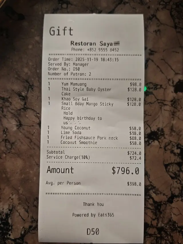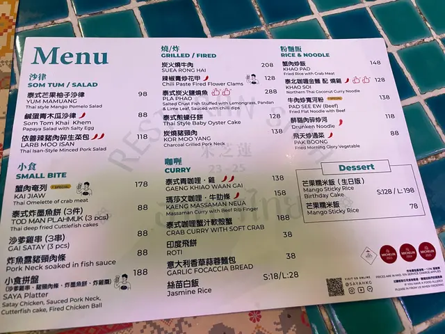 大角咀利奧坊地下嘅「Restoran SAYA」,主打正宗泰式滋味,環境充滿泰國街頭風情,燈光暖黃有氛圍,鍾意泰菜嘅一定要book位!炭火燒物招牌必點🔥泰式炭火鹽燒魚$288🐟 新鮮魚肉用鹽包裹炭火慢烤,外皮焦香帶鹹,內裡肉質嫩滑多汁,鎖住滿滿海鮮鮮味炭火燒牛肉$208🥩 烤得外焦內嫩,肉汁豐盈,蘸埋泰式醬汁,香辣惹味,越食越香~多人聚會必揀小食拼盤$188😋沙嗲雞串香嫩多汁、豬頸肉條爽脆鹹香、炸墨魚餅彈牙十足、炸雞棗外酥內軟,四款小食一次過擁有!主食同蔬菜一樣出色!🌟泰北咖哩金麵配燒雞$128🍜 咖哩濃郁香醇,金麵吸滿醬汁,燒雞軟嫩入味飛天炒通菜$88火候十足,鑊氣滿滿,香味滲入通菜,爽脆解膩~生日慶祝必點生日版芒果糯米飯$128🥳新鮮芒果夠哂甜,糯米軟糯帶椰香,擺盤精緻生日更有儀式感!班蘭椰林飄香$88🍹班蘭香混住椰香同酒,清甜解油膩椰汁沙冰$58 🥥冰涼順喉,完美中和泰菜嘅酸辣~想搵正宗泰味,仲要環境夠哂chill~無論燒物、咖哩定甜品都好有水準,Restoran SAYA絕對值得一試!…查看更多