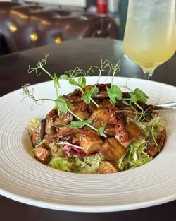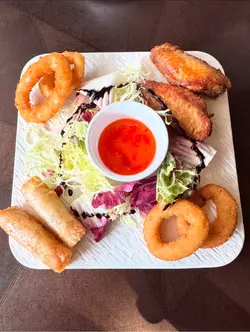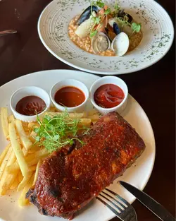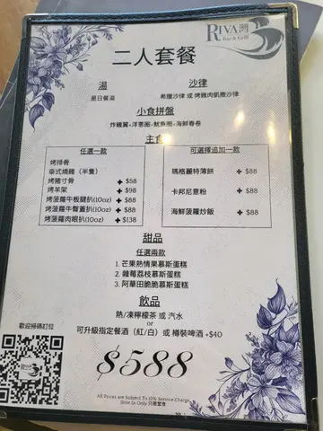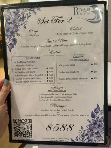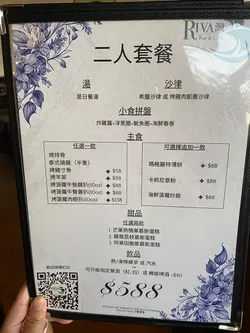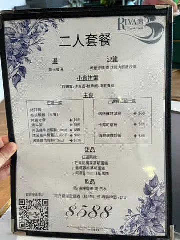 今日約同好友去馬灣遊玩,順道去位於馬灣珀麗路8號珀麗灣沙灘廣場1樓1-3號舖的<Riva灣 Bar & Grill> 食午餐,餐廳位於沙灘旁邊,望著青馬大橋,一邊享受美食,真係非常悠閒的時光。我哋點咗一個二人套餐:📍是日餐湯:蘑菇忌廉湯的湯底濃郁,蘑菇味濃,十分好飲。📍小食拼盤:有炸雞中翼、炸魷魚圈、炸洋蔥圈和炸春卷,四樣炸物都香脆可口。📍烤雞肉凱撒沙律:份量不少,沙律菜新鮮好味,雞肉烤得皮脆肉嫩,十分好食。📍烤菠蘿肉眼扒10安士:賣相繽紛吸引,五成熟肉眼扒的牛味香濃,肉質嫩滑,菠蘿新鮮又鮮甜多汁,好滿足的菜餚。📍甜品:阿華田翠翠慕絲蛋糕,口感軟綿好味,擺設精美用心。📍凍檸檬茶:清涼好飲。…查看更多