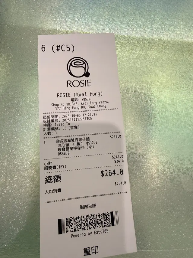 店名:Rosie地址:葵芳興芳路177號葵芳廣場地下18號舖今天剛好收工黎開葵芳附近,一直都見到地鐵站附近有一間好特別嘅餐廳,今天終於有空試一下,Menu大部分都是Pasta 黎,愛Pasta迷必來1.巨頭蝦蒜香油天使麵 $218打卡一流,蝦頭超大隻,上菜時擺放得好靚,蝦頭有蝦膏,蝦肉彈牙,天使麵配上蒜香油,好惹味,好好食🤤🤤2.龍蝦濃湯蟹肉帶子麵 $198龍蝦濃湯好濃郁,配上蟹肉帶子好邪惡😈,但味道真的不錯,麵條搭配上龍蝦湯跟蟹肉搭配,好正👍主食可以小食,加了二個小食,一個是炸薯條配黑松露蛋黃醬$20,另一個是忌廉菠菜$20,薯條炸得好脆口,配上黑松露蛋黃醬或茄汁,好滿足;另一個忌廉菠菜要小心熱,因為是即焗,但熱辣辣食又好正3.自家製提拉米蘇$88提拉米蘇好食,店家是將整盆提拉米蘇拿出來,再拿一個大匙放在碟上,好有儀式感食完發現店家有認真做好每碟意大利粉,價格又親民 ,有別於連鎖店意粉總價連加一$598…查看更多