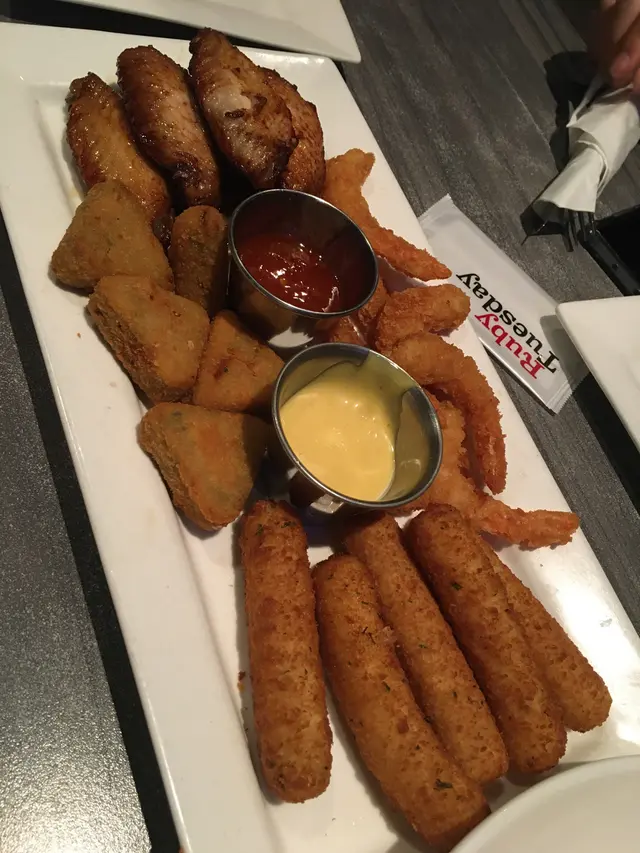星期五Happy Friday,做嘢好大壓力,想放縱一下自己,就揀左食邪惡嘅美式晚餐,見Ruby Tuesday 會員有五折,就Walk In食呢間,等左大半個鐘先有得入座,建議要book定位先。我地叫左Ribs and Wings,Buffalo Wings醬汁好入味,仲熱辣辣上碟,非常開胃,有成6隻。Ribs要蜜糖味,Ribs整得好腍,都好好食,配Smashed potato。然後我地仲叫左個Classic Burger,配薯條,都係好食。會員仲有個Welcome Offer送Chocolate Cookies,配雲呢嗱雪糕,Cookie係大大塊鐵版上,等左15分鐘,因為即叫即整,熱辣辣整好,雖然甜左少少,但都幾好食。我地仲叫左杯Mega Size Refresher,略嫌甜左少少,但見到咁大杯非常開心😂。總括黎講,今餐食得好開懷,好開心,而且價錢唔貴。查看更多