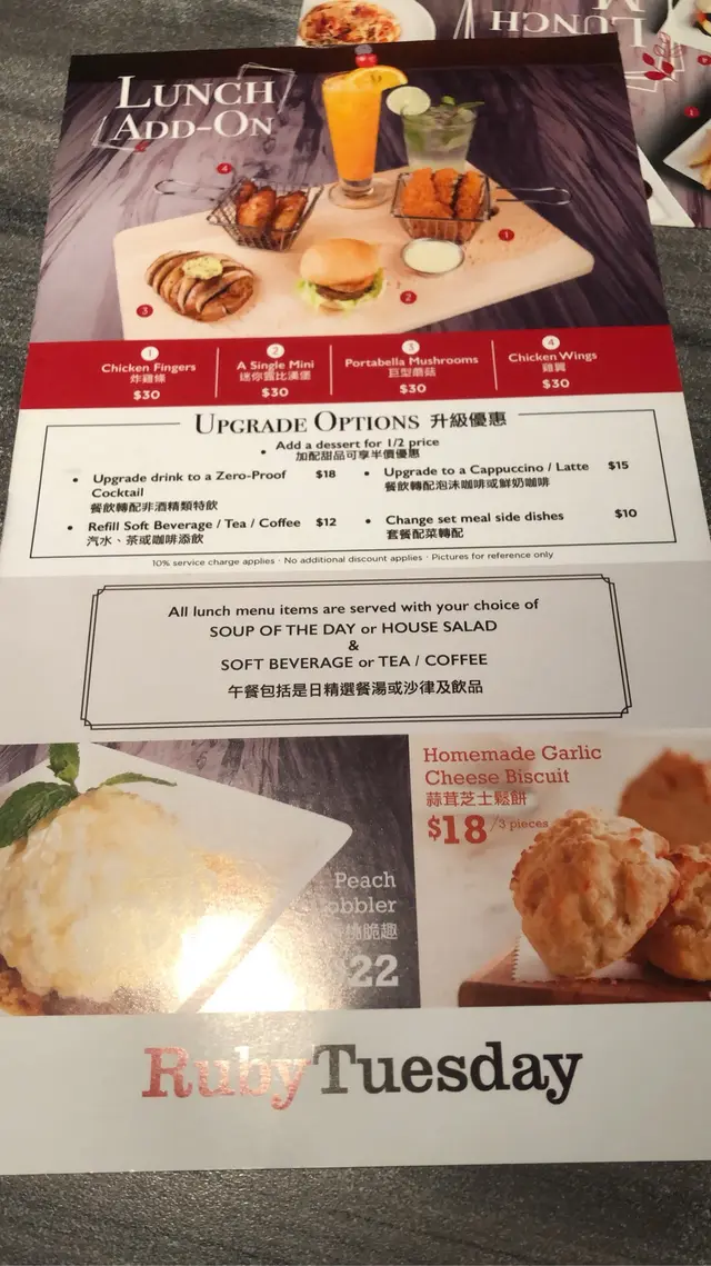 Ruby Tuesday 有朋友講過 食過好味既燒豬筋骨係RUBY TUESDAY, 咁岩3有客戶優惠,有7折同 加 $33 有經典芝士漢堡,當然第一時間 去食下啦!!但最最最令我失望係 等左1HRS 既台 明明有勁多台 都唔比我地入去坐即使係限台令 1.5M ,哩一間RUBY TUESDAY其實好大,,,我等位 等左1HRS真係 為左個JETSO如果唔係…走左十世啦!!!再者 服務都真係差左好多個個都黑口黑面食個飯姐…唔洗咁既好啦…講返D 食物Fork-Tender Ribs(半份 - Classic BBQ 經典燒烤汁) 餐廳嘅招牌菜ribs,上台已經夠震撼,一切落去就好容易分到出嚟,食落去仲要肉質好腍,稍稍切開已經骨肉分離。最中意腍到散化既口感而且汁好香 重有少少木香味 係好好味既加 $33 有經典芝士漢堡只係加$33 就有經典芝士漢堡 漢堡扒汁多 熟度都可以揀 唔錯最後叫埋甜品apple crumble第一次食 已經食唔停口, 蘋果焗得好好味ice cream 加一熱一凍幾特別,但2個人食,真係好飽每人食幾啖就冇晒查看更多