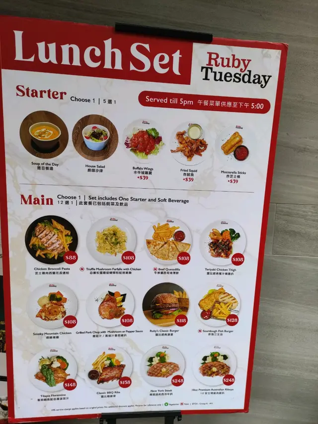 Ruby Tuesday (2000年廣場) (銅鑼灣) 網上訂座享低至75折優惠兼賺Rice Dollars 網址: https://s.openrice.com/QrbS0M60B00 地址: 香港銅鑼灣羅素街2-4號2000年廣場2樓 電話: +852 37517320