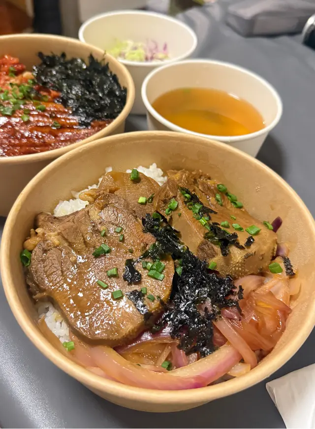 晚餐唔知食乜嘢,求其附近買個丼飯,味道都唔錯,可以試吓 食物 : 炙燒慢煮厚牛舌丼$53 ,再加$3外賣盒錢 ~ 牛舌有四大塊,厚切,味道唔錯,夠入味夠淋,但有好多洋蔥絲,套餐包沙律及味噌湯,味道正常 泡菜伴厚燒鰻魚紫菜丼$79,另加$3外賣盒錢 ~ 鰻魚都幾大塊,有好多泡菜,整體味道正常,套餐包沙律及味噌湯 環境 : 外賣,不在內食 服務 : 店員有禮貌 費用 : $138 (包含$6外賣盒錢)…查看更多
