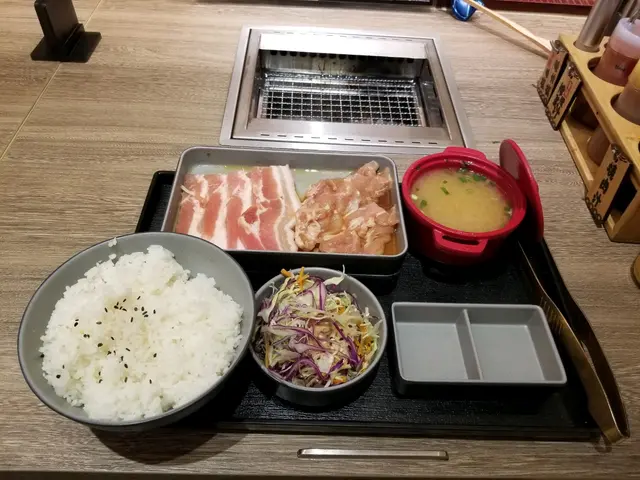 一人燒肉定食,份量好足。定食包括:一份豬、牛 or雞 or mix ,以重量計,有100 、200 & 300g 選擇飯一碗,可加$轉紫菜飯味噌湯一碗沙律菜一碟一人一爐烤,每枱提供3款醬料調味除咗燒肉, 還有熟食定食選擇 👍查看更多