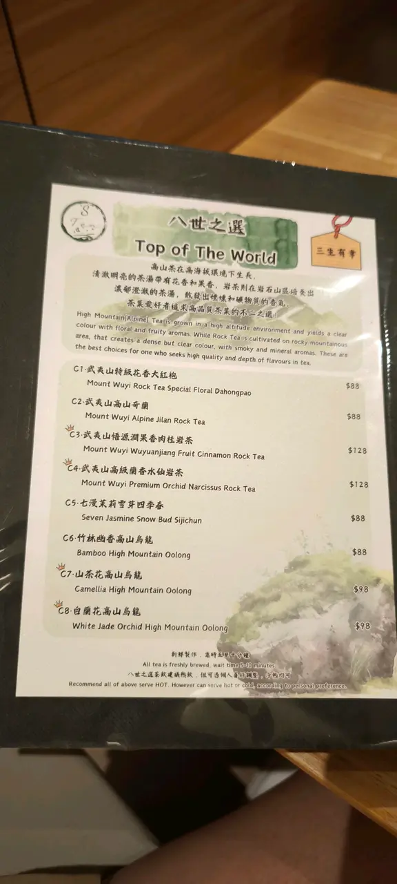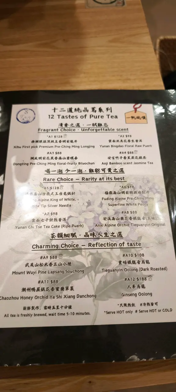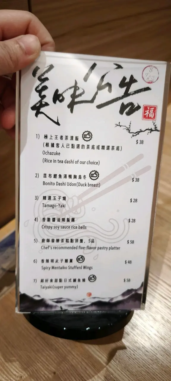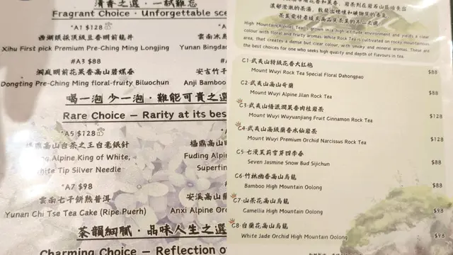 今天剪完頭髮後來到商場逛街,逛累了便想找間咖啡店休息一下,剛巧看見這間茶館,餐廳沒有限時,熱茶可續水,而且有不同的茶飲選擇,小食亦很吸引,於是便決定來嚐試一下。環境方面,可能香港人不喜歡喝茶,只喜歡喝咖啡,所以餐廳很寧靜清幽,沒有什麼人,可惜座位有點狹窄,當叫太多食物的時候便顯得有些擠迫。個人喜歡的中式茶包括了白茶、龍井和烏龍茶,今次便先試試白茶~福鼎白毫銀針,老公則點了凍的白蘭花高山烏龍。由於小食價錢吸引,所以點了鴨胸烏冬、玉子燒和明太子雞翼。白毫銀針是一款清茶,茶味非常清香之餘,更十分清新爽口,同時帶有少許煙熏的氣息和水果的芬芳,以及一絲絲野花香氣,香氣淡雅,回甘持久,滋味醇厚。至於白蘭花高山烏龍的味道則比較濃厚一點,除了嚐到白蘭花的清香,更品嚐到烏龍茶的醇厚,層次分明,這款我們點了冷飲,特別適合在夏天飲用,能夠消暑解渴。至於小食方面亦相當出色,鴨胸烏冬的烏冬很爽口彈牙,雖然本身沒有什麼味道,但是加上餐廳的七味粉之後,味道即刻昇華了很多倍,鹹鹹的同時帶有一絲辣味,味道層次相當豐富,是我品嚐過最出色的七味粉。至於玉子燒太薄身了,而且燒得太久,口感有點粗糙,不夠柔軟幼滑,幸好明太子雞翼鮮美多汁,肉汁四溢,每一口都嫩滑可口,味道微微香辣,其味無窮,珍饈美味。價錢方面,福鼎白毫銀針$128,白蘭花高山烏龍$98,鴨胸烏冬$38,玉子燒$28和明太子雞翼$48,餐廳沒有加一服務費,最後兩人總共$340。總結來說,今次品嚐的白毫銀針和白蘭花烏龍都很清香可口,餘韻悠長,在香港沒有太多地方可以品嚐到中式茶,最重要這裡沒有限時,熱茶又可以無限續水,小食價錢便宜味道又出色,下次有機會一定會再來喝茶。最後純粹有感而發,其實香港人喜歡喝咖啡多過喝茶,可能價錢比較吸引吧,50元便可以坐一整個下午,而這裡可能價錢比較貴,今天下午只得兩台客人,希望下次來的時候仍在,畢竟在香港地很難找茶館。…查看更多