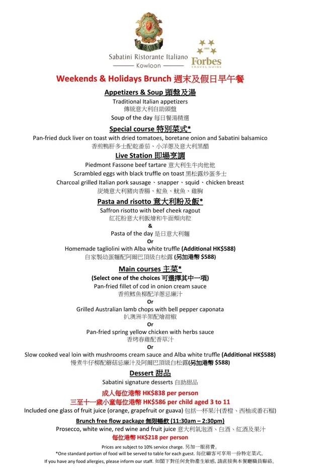 以官網優惠價$754享用原價$838 嘅Sabatini周末早午餐,整體體驗相當滿意。餐點安排精緻,除主菜需選擇一款外,意粉及燉飯唔使決擇,各有一份(當日可同時品嚐紅花粉意大利飯燴和牛面頰肉粒 & 是日意粉),鵝肝每人一客,其餘冷盤、熱食及甜品皆可自由取用。亮點推薦:- 冷盤海鮮品質出眾,龍蝦與蟹腳鮮甜度比一般自助餐好。- Live station的生牛肉他他調味得宜,黑松露炒蛋更是亮點——松露香氣濃郁,搭配香脆薄多士,令人回味。- 每位一客鵝肝,肥美而且夠厚,非常好食。- 炭燒意大利豬肉香腸、魷魚、魷魚、雞胸比較普通,香腸比較咸左少少。- 意大利飯燉煮得宜,米粒飽吸醬汁清香 。- 主菜香煎鱈魚火候精準,外皮微脆而肉質細嫩如絲。-羊架好食,medium熟度剛好,肉質好鮮嫩。- 甜品區延續帝苑酒店傳統,多個whole cake都有供應,朱古力蛋糕濃醇綿密,焦糖燉蛋滑順誘人。雖水果選擇較少,但整體食材品質、烹調技巧與服務氛圍俱屬上乘,以後慶祝特殊節日時都會想再訪!…查看更多