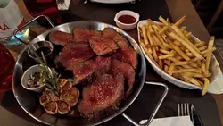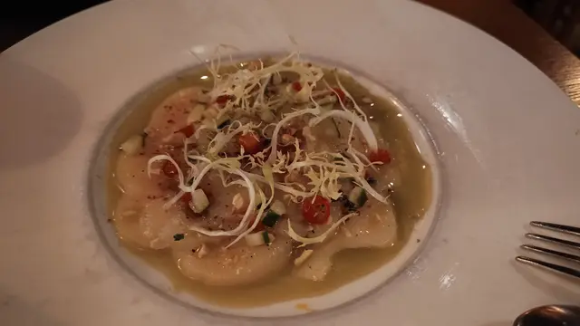 見呢間餐廳食評不錯便訂了枱和太太食生日飯,餐廳人客不多,所以樓上冇開,一位男侍應帶了我們到中間位,但見到窗邊有空的兩人枱便問可否坐那裏,起初該他說可以但不到一秒鐘後面另一女侍應提示已有人訂了,我們唯有選另一邊中間位坐;但全晚根本再冇人訂兩人枱,後來一對外籍男女沒有訂枱卻安排坐了該兩人枱☹️,感覺被歧視....食物方面點了Scallop Carpaccio和Tenderloin Centre Cut (600g)和太太share。頭盤賣相不錯,但帶子完全食不出味道,單靠那極少許的榛子和士多啤梨挽回一丁點分數。牛扒反而冇失望,有肉質有肉味,心情也好番一些,食完都飽哂,再食唔落甜品。除了坐位安排感失望外全晚該男侍應服務很好,其他女侍應就很一般,毫無笑容。環境氛圍其實不錯,但人多起來時會感到擠逼。最後想補充一支Still Water收$78+10%!😱…查看更多
