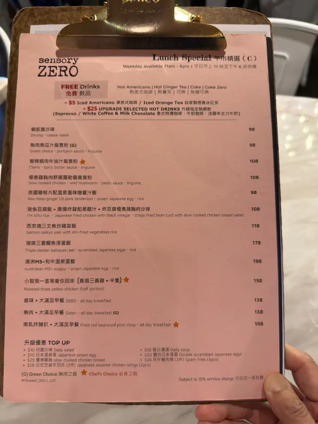 喺尖沙咀 sensory ZERO 嘆咗個「大滿足早餐」,睇落好吸引,但食落去就真係一般。澳洲 M5+ 和牛放喺多士上面,配啲水果,睇落高級,但牛味唔夠濃,油香唔突出,成個配搭唔太夾,得個樣。反而乳酪配乾果麥片係成餐最好嘅部分,清新唔膩,有啲健康感,食完心情都好啲。煙肉煎得唔錯,唔會太油;薯餅外脆內鬆但味道淡;焗豆罐頭味重;炒蛋滑但冇蛋香,整體都係「正常發揮」。咖啡叫咗杯 latte,拉花靚,味道穩陣,唔算出色但都唔差。HK$238 唔算平,以味道嚟講唔太值。環境舒服,服務有禮,但食物冇驚喜,唔係伏,只係唔滿足。…查看更多