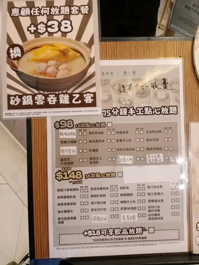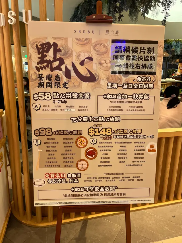 之前經過一次沒有吃到點心放題,今次再到荃灣就去SENSU試試看。餐廳裝潢整潔,落地玻璃光線充足,令客人坐得舒服。店員會問你試哪一個套餐,有$58,$98或$148,咁啱沒有$58,就試試$98元16款點心的套餐。店員先端上荔枝烏龍茶,用上荔枝烏龍茶,感覺不錯,口味清新。餐廳中間有一個自助吧,有一些沙律,甜品,青瓜前菜等。問心,可能因為已過午飯時間,餘下的前菜不多,質素就一般般,算是開胃前菜還可以。客人可選擇用餐牌或電話掃描qr code落單。怕一個人食唔曬,先叫了五個點心。迷你叉燒飯。叉燒比較乾身和瘦,可以改善炸鮮奶。除了皮炸得比較黑之外,算脆和好吃蟲草花蒸燒賣。六角蒸籠比較特別,燒賣質量還好櫻花蝦腸粉。雖然腸粉內沒有櫻花蝦,是碎碎的舖上面,口感和賣相都有驚喜。炸雲吞,稍為硬蒸排骨。就不算太特別整體來說,以快餐形式提供點心放題,性價比還算不錯,三五自己喝喝茶,點幾款點心,都可消磨一個下午。店員話暫時點心放題到1月19日,之後公司未有通知。