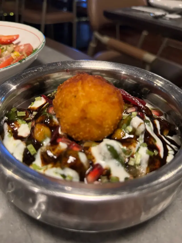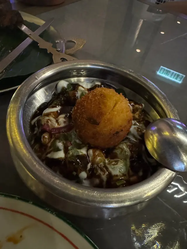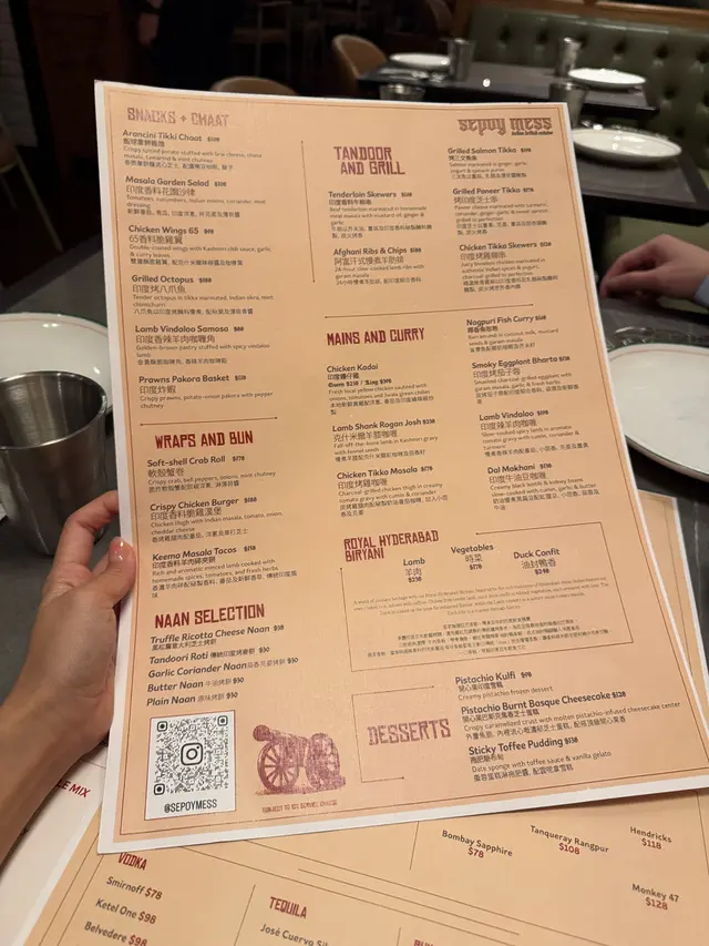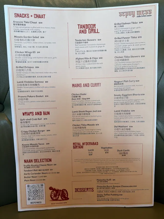 餐廳裝修有啲木系設計加軍事元素,氣氛chill又有格調,啱晒週末慢慢歎。菜式走英印fusion路線,香料味夠、擺盤靚,食物有驚喜。🥗 Masala Garden Salad 前菜沙律清新開胃,青瓜、番茄、洋蔥加香料醬,唔會太搶味,啱晒熱身。🦐 Prawns Pakora Basket 炸蝦外脆內嫩,香料味唔太重但夠香,配埋酸辣醬一齊食好惹味,唔會太油膩,幾啱配杯Gin Tonic。🍛 Chicken Tikka Masala 主菜重頭戲!雞肉嫩滑,masala醬濃郁但唔膩,香料層次分明,撈飯或者撈naan都一流,食到停唔到口。🫓 Garlic Coriander Naan Naan外脆內煙韌,蒜香加芫茜味好突出,撈醬一齊食真係冇得輸,係成餐嘅靈魂配角。🍮 Sticky Toffee Pudding 甜品係拖肥糖布甸,熱辣辣上枱,外脆內濕潤,配雪糕做到冰火交融,朱古力味濃但唔死甜,食完超滿足。整體感覺:香料味夠、環境舒服、食物有誠意,甜品仲係收尾王者。下次想歎英印fusion,Sepoy Mess可以bookmark低,值得一試!…查看更多