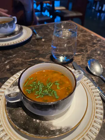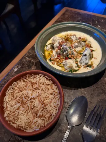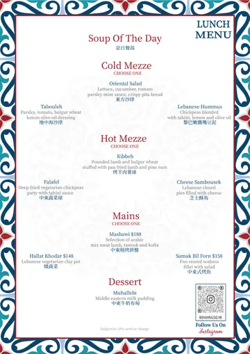 Shahrazad黎巴嫩餐廳的感官盛宴一出電梯金碧輝煌,以藍色為主調嘅設計,昏暗嘅環境添加咗神秘感,完成體驗到異國風情,空氣中浮動著香料與烤肉的溫熱氣息【前菜:葡萄乾鷹嘴豆蓉】月光般乳白的鷹嘴豆泥鋪成圓形圈,中間帶點葡萄粒,金黃橄欖油匯成漩渦,葡萄乾的蜜甜配現烤皮塔餅撕開時騰起的麥香,以及熱辣辣,相當可口。【蒜香檸檬蝦】肥美海蝦食落爽口彈牙,混合蒜片,檸檬汁,完全將蝦嘅鮮味帶出配合羅勒葉,香草🌿,惹味又開胃【美國牛肋肉燉秋葵】秋葵的黏液化作濃稠醬汁,燉至酥爛的牛肋肉。番紅花與肉桂在舌尖上留有餘香秋葵的清脆與牛肉軟腍,香濃牛肉油脂香,Base 用上大量蕃茄,加配煙燻Ouzi 香飯$38 ,飯香十足,感覺有啲似黃油飯【澳洲羊架串】炭火上烤過嘅羊架灑上孜然粉,外層羊肉粒烤到煙燻微燶,唔會過分油膩,點一點薄荷酸奶,中東味道完美帶出伴碟配有車厘茄,甜酸洋蔥【開心果米飯布丁】不可或缺的甜點🤭見個名好得意,又飯又布丁,究竟係咪甜品黎一食落去充滿驚喜,奶香混和開心果米飯粒,面頭襯有玫瑰花瓣碎,開心果碎,每一啖開心果味好濃郁,食落軟滑,感覺好幸福食飯途中有個女郎出嚟跳肚皮舞相當驚喜,裙褂飄逸帶動全場氣氛,感覺令人沉醉,贏來全場掌聲餐廳裝潢充滿左神秘阿拉伯風情,感覺令人放鬆,呢間絕對係值得一試嘅中東餐廳,食物同環境都好吸引,連Toilet設計都相當美…Read More