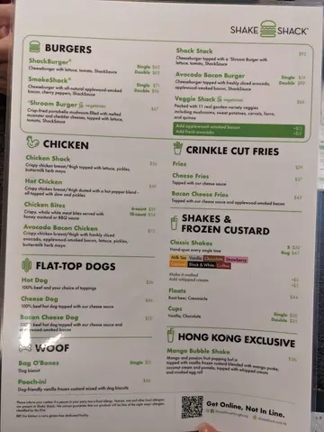 After dropping off a friend at the airport, my company and I went to Tung Chung for shopping. We stopped by here for food to refresh our body and mind. There are several workstations for self-service order, or can choose to line up at counter for staff’s service. We preferred to choose our seating indoor rather than outdoor and started ordering by using the QR code on the table. Finally, we chose two sets of combos “Shack for 2” as there were value added choices for fries and drinks. We grabbed water and washed our hands at the self-serve counter while waiting for the food.Combo 1 $265Texas BBQ Burger - SingleIngredients included Angus beef, fried jalapeno, pickles, onion and Texas BBQ sauce. A nice soft bun, the ingredients were exceptionally juicy, flavors including tangy and spicy, tasted very good! Shack Burger - SingleA typical cheeseburger having ShackSauce, fresh lettuce and tomatoes. The bun added a soft and slightly sweet base. The melted cheese added creamy texture to the beef patty while lettuce and tomatoes contributed to the freshness sensation, yummy!Chicken Bites 6-count with BBQ sauce Tiny pieces looked like a small snack, crispy outside and better to dip BBQ sauce for potent taste. Cheese Fries Ordered one fries with cheese sauce. Fries had a thick crinkle-cut easy to dip with cheese melted on top. The melted cheese was soft and pliable, acted as a moisturizer for the crispy fries that helped to stimulate appetite. The crispness and softness from fries together with cheese’s scent and taste, a guaranteed successful combination!