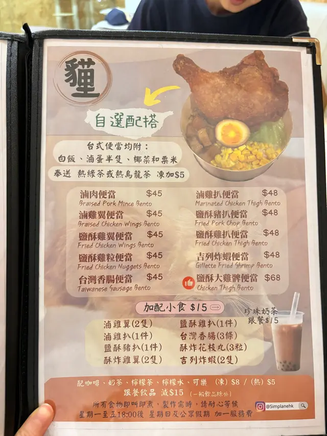 收工約咗閨蜜去觀塘工廈搵食,上到Simp.lane見到成間木系cafe咁,仲有玻璃貓房🐈⬛!幾隻肥貓喺入面打晒交超治癒,座位闊落仲有boardgame玩,等上菜時唔會悶親。晚餐時段人唔算多,坐低仲聞到陣陣香茅味,即刻肚仔打鼓~香茅冬陰功豬扒配椰菜花飯 ($88)豬扒大過我塊面🐖!煎到金黃色好香口,冬陰功味好出仲帶少少辣,可惜邊位有啲乾爭爭。椰菜花飯先係精髓🥦,切到碎粒粒同蛋炒香,食落好似真飯咁有咬口,仲好有飽肚感,低碳餐嚟講超驚喜!鹽燒牛脷椰菜花飯 ($98)牛脷厚切過手指公👆🏻,鹽燒脆皮咬落卡嚓聲,入面keep住juicy彈牙。配埋爽脆秋葵同炒香椰菜花飯,成個組合好和風,唔使落飯都食到舔舔脷~鹽酥大雞髀便當 ($78)上枱真係嘩一聲🤯!雞髀大過碗飯成隻手掌咁長,鹽酥脆皮薄過我塊粉底,咬開熱辣辣爆肉汁🐔。滷肉飯底好邪惡,半隻滷蛋入味到連蛋黃都有滷水香,大胃王必點!五色豆腐花甜品控見到雙眼發光🌟,滑溜豆腐花鋪滿芋泥/紅豆/珍珠/芋圓,珍珠煙韌芋圓QQ的,甜度剛好唔漏喉,完滿收尾~…Read More