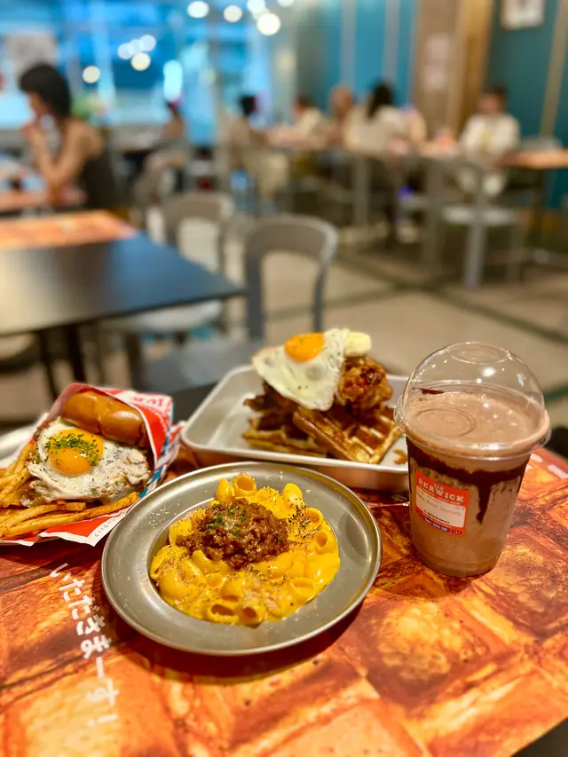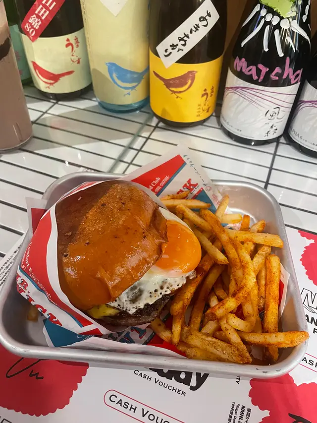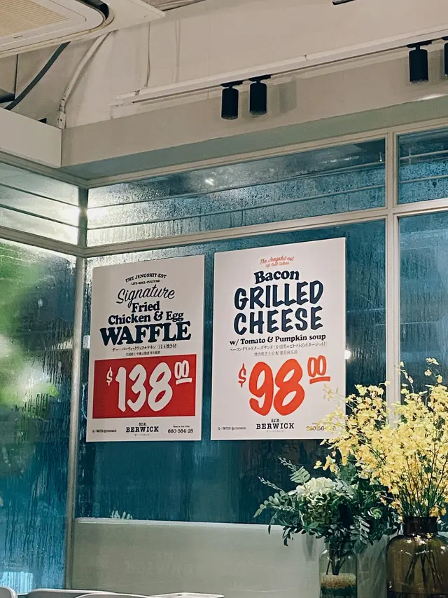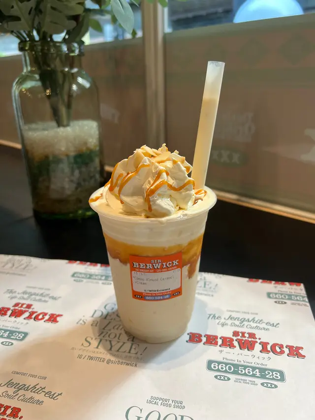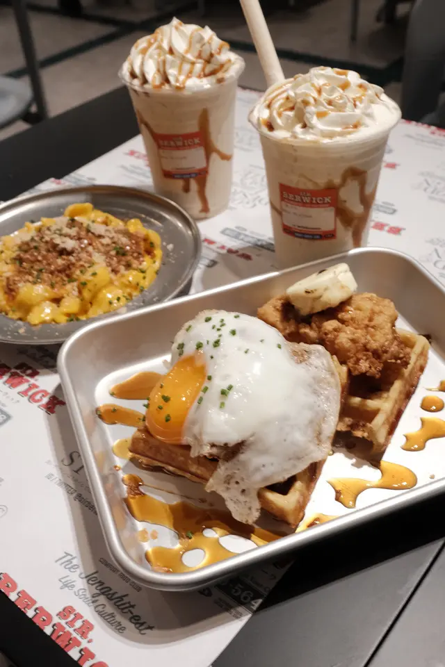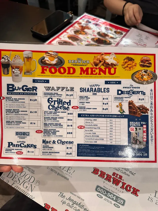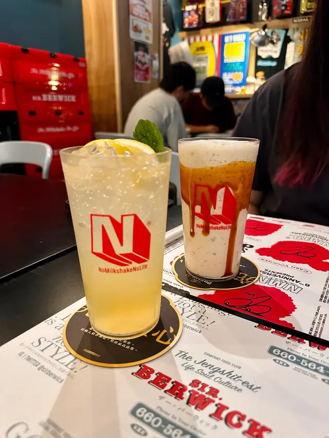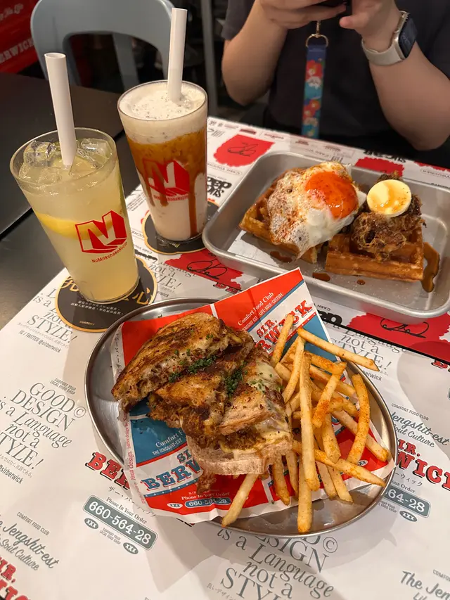 Sir Berwick裝修走日式風格適合同朋友慢慢食、傾偈打卡。今次主食叫咗和牛芝士太陽蛋漢堡, 炸雞太陽蛋窩夫。和牛芝士太陽蛋漢堡配香辣薯條 ($138)日式和牛漢堡扒,漢堡厚同大塊,肉質鬆軟多汁,太陽蛋完美流心配和牛漢堡超級夾,味道層次豐富。而香辣薯條辣度溫和。炸雞太陽蛋窩夫 ($138)而咖做緊 ($109)!!!日式唐揚炸雞配窩夫意外地夾!炸雞係外皮薄脆,肉質Juicy,食落去唔覺得油膩。再加上太陽蛋既蛋汁撈窩夫,邪惡但滿足!而窩夫,外脆內軟綿,淋咗蜜糖後,甜鹹交織,好特別。而飲品分別叫咗香蕉朱古力奶昔 ($59)同青檸批奶昔 ($69)奶昔都有驚喜,香蕉朱古力奶昔,口感順滑,朱古力味濃但唔會太甜,可以加錢加cream,打卡靚啲。青檸批奶昔,呢款真係必試青檸批款超Refresh!飲落去似冰凍版檸檬批,超級解膩,清新解渴。…查看更多