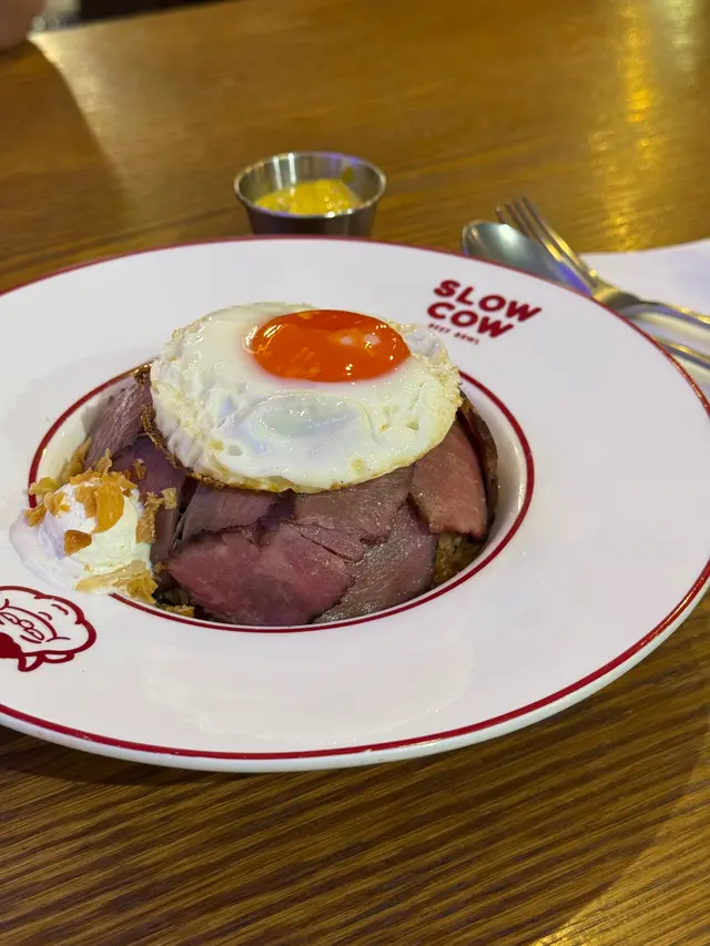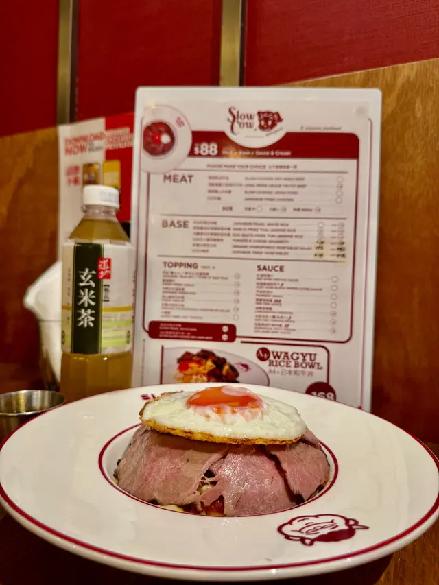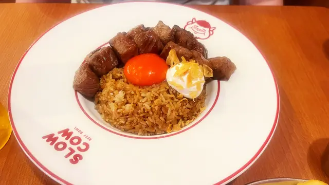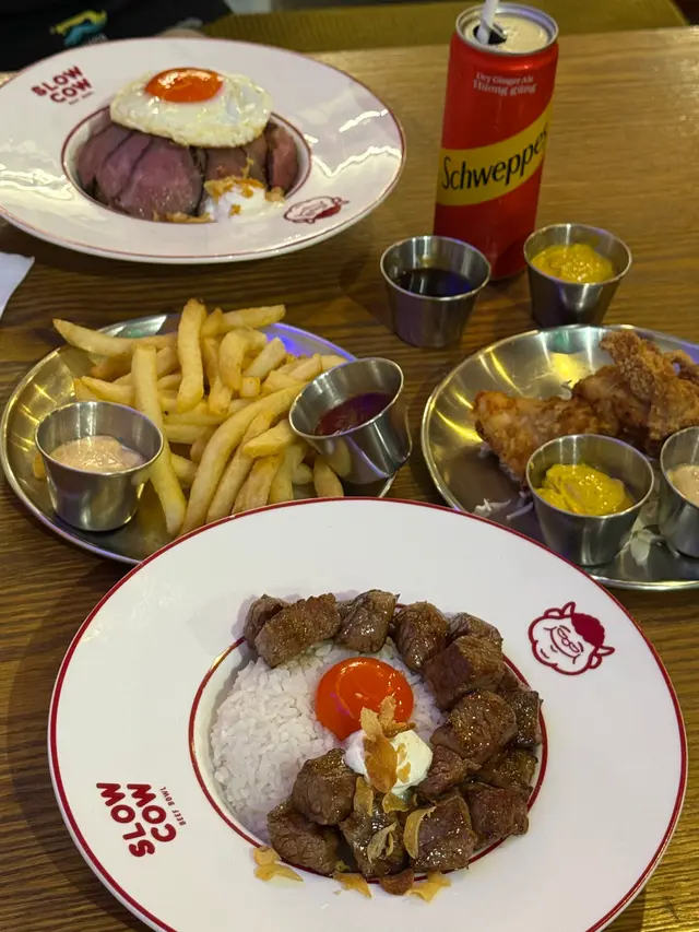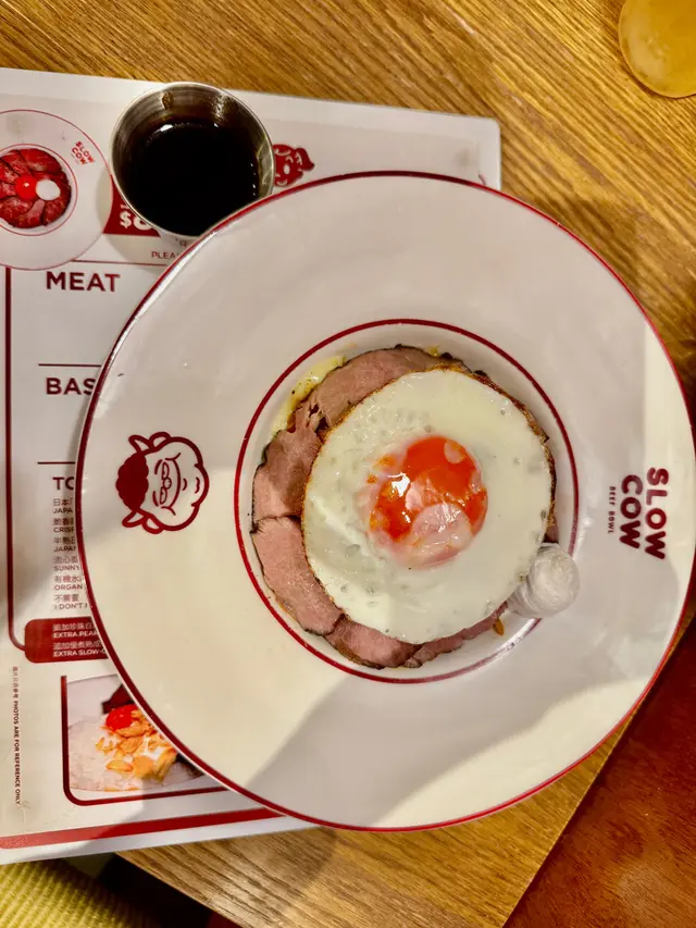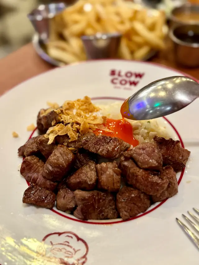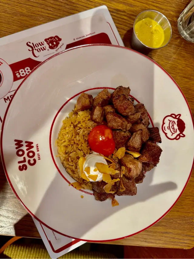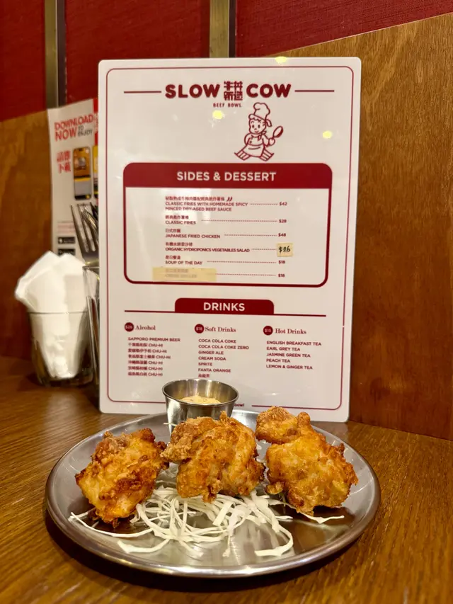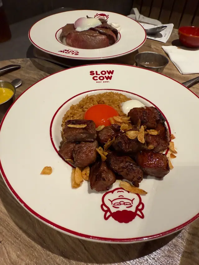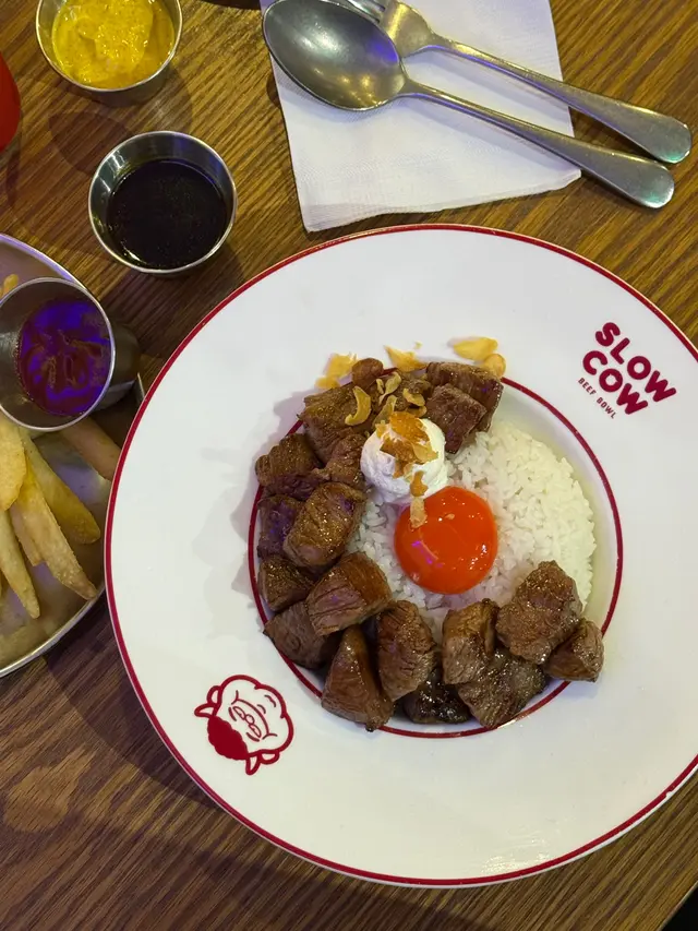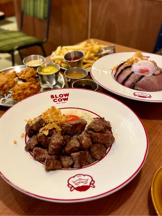 #chuchu食在尖沙咀📍 SLOW COW又係bookmark咗好耐嘅餐廳🥹喺K11 Art Mall HOW入面!成日見到啲牛都好想食!Style 有啲似美式又日式,坐得舒服!上菜都好快!💡平時應該都要等位的—————————————————————❣️ 慢煮熟成牛肉 $88 ▫️ 蒜香醬油炒泰國絲苗米飯 +$6▫️ 半熟日本溫泉蛋 +$10▫️ 芥末籽肉汁賣相💯 招牌,100%慢煮牛肉,牛肉係粉紅色,肉質好嫩滑,牛味好濃!醬油炒飯炒得乾身,有淡淡蒜味,炒到粒粒分明!.❣️ A4日本和牛丼 $168▫️ 淡麗蛋白炒泰國絲苗米飯 +$6▫️ 紅酒照燒汁呢個本身已經跟咗生蛋黃同蒜片!和牛切成粒粒,嘅油脂分佈平均,牛味好濃,真係好正!蛋白炒飯炒得好乾身,粒粒分明,撈埋生蛋黃!.❣️ 日式炸雞 $48本身已經配咗炸雞醬,另外加咗個咖哩蛋黃醬 +$8,同炸雞好夾!炸雞有4件,炸得超脆!.❣️ 經典脆炸薯條 $28