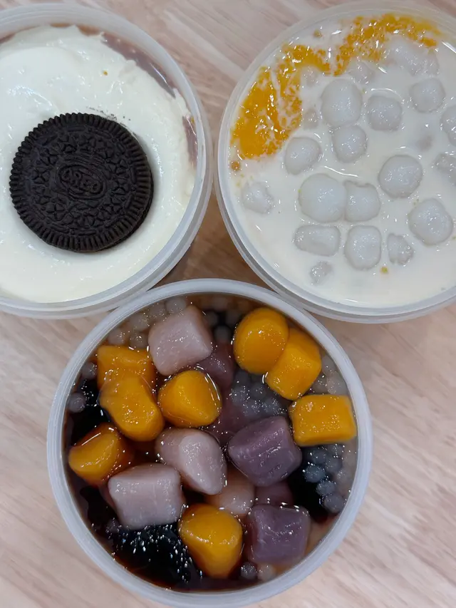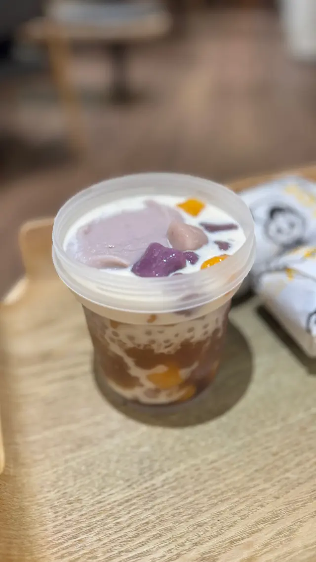 ,加上內有三色芋圓、小丸子、珍珠、豆乳布丁和榴槤奶蓋,下了特調椰奶,真是味道與口感也無所挑剔,實在豐富,超好吃喔