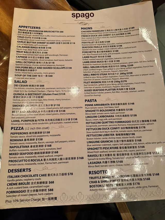 一行人預訂了這家意大利餐廳,環境是燈光昏暗,裝修有情調。食物選擇豐富,我們享用了以下美食:辣肉腸薄餅($158)辣肉腸有鹹香之餘,只算微辣,易入口。蕃茄醬清新怡人,餅底香脆。蟹肉蝦肉意大利飯($168)份量極之多,夾雜了新鮮的蝦肉及蟹肉,味道帶點海鮮的香氣。飯粒外軟內硬,充滿口感。肉醬千層麵 ($168)剛烘焗的千層麵,溫度極高,蒸氣冒起,香噴噴。牛肉醬味濃,千層麵嫰滑。燒西冷牛扒(300克)($248)擺盤精美,牛扒煎至5成熟,仍鎖緊肉汁,質感嫰滑,肉紋整齊。配菜的薯條香脆但不算油膩,其他蔬菜爽口。意式慢烤豬腩肉($188)入口出奇軟滑,肉質一梳梳,亦吸收蜜糖汁的甜美,絕對有驚喜,一吃難停。意式朱古力蛋糕($78)溫暖的朱古力蛋糕,味道極濃。配了一球微甜的雲呢拿味雪糕🍦,冷暖交融,是最高享受。法式焦糖燉蛋($68)表面焦糖香脆,燉蛋軟滑,甜度適中。服務方面,店員人手充足,效率高。…查看更多