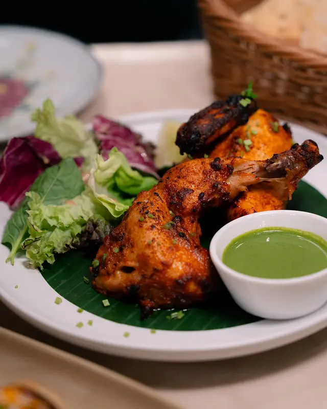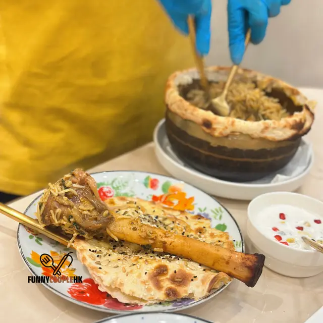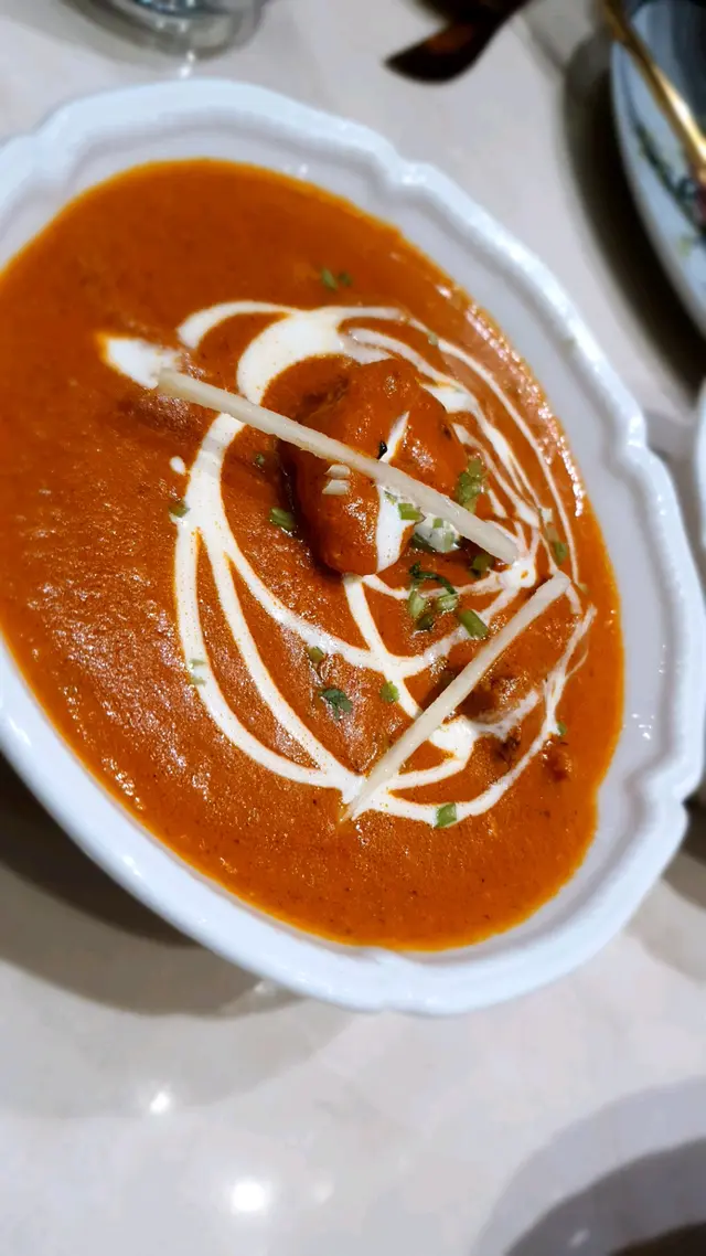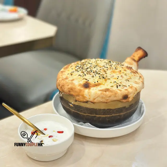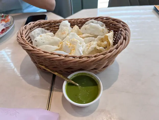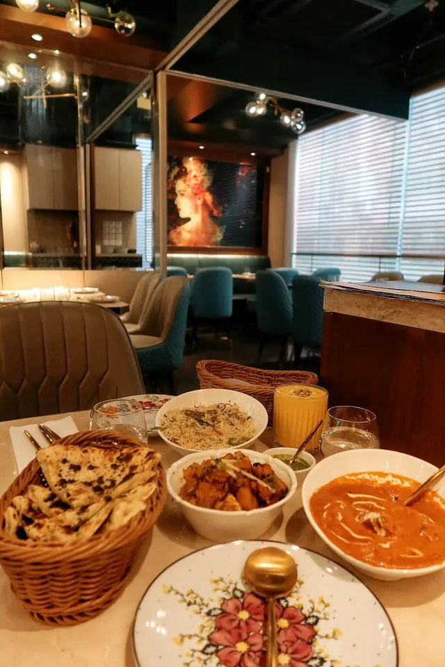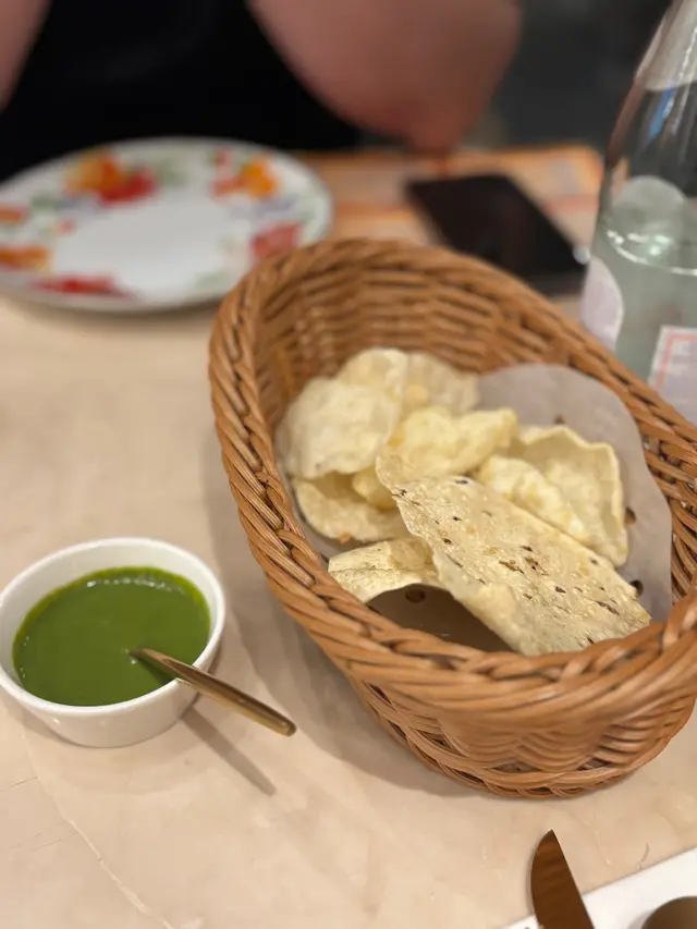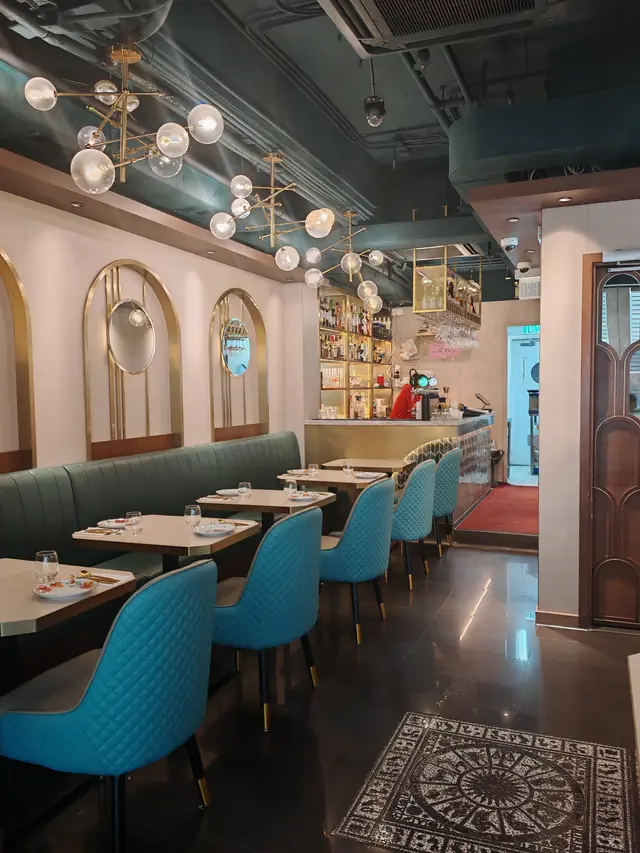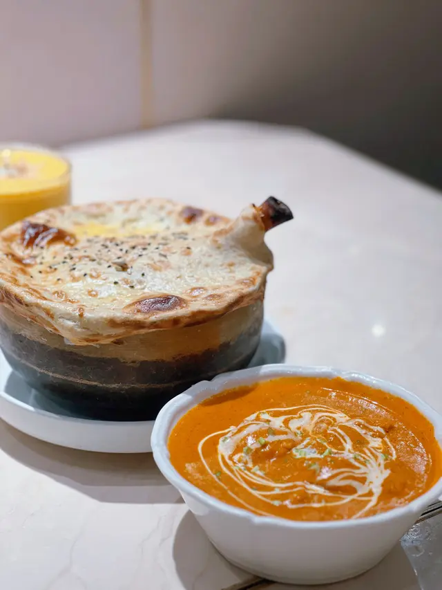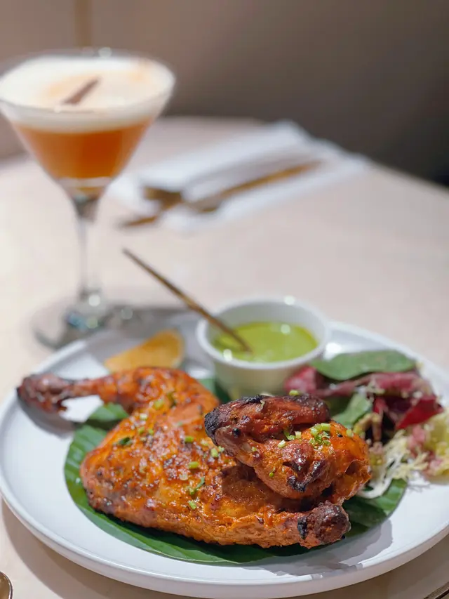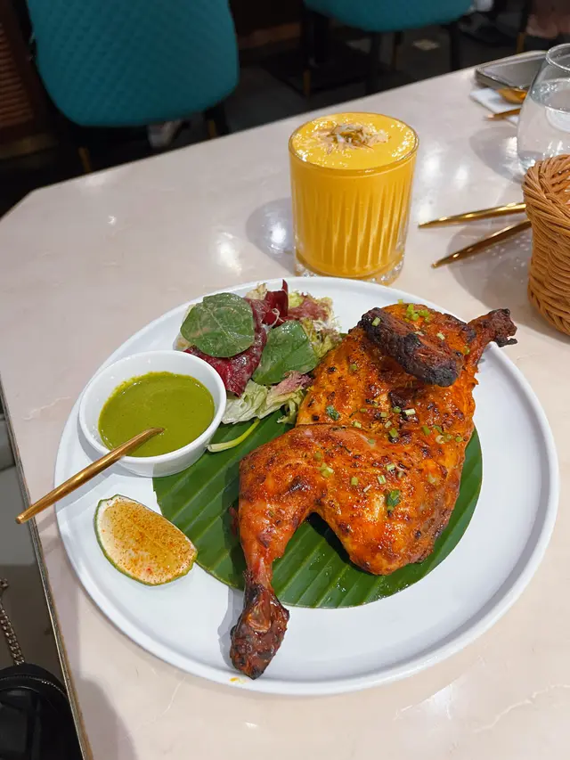尖沙咀寶勒巷有間印度菜餐廳🇮🇳原來係由前杜拜皇室御廚主理👨🏻🍳採用天然香料代替人造色素來製作Fusion印度菜🍽️ 一到門口就已經見到色彩繽紛既手繪牆畫,入去餐廳後,藍綠色配白色,營造優雅又舒適既感覺✨今次同哥嫂來食晚餐,我地叫左:.🍗胡椒烤雞(半件)睇賣相就知用足香料去烤香,我地揀左小辣,雞皮焦香脆,內裡雞肉卻嫩滑多汁,旁伴沙律菜同薄荷乳酪!.🍱海德拉巴羊腿香飯羊腿飯係一鍋咁上,頂層有酥皮包住熔香🥧 會有專人幫你切開同撈勻,羊腿經慢煮6小時,所以肉質軟腍!香飯撈埋醬汁食幾惹味.🥘奶油雞Butter Chicken 係經典印度菜,醬汁濃郁且豐富,撈飯或叫Naan點醬食都好夾!.🥙脆餅籃裡面有兩款,一款係薄脆片,脆卜卜!另一款係自家製炸蝦片,點上旁伴的薄荷乳酪夾哂.🥭Golden Mango LassiLassi係食印度出名既招牌飲品,即芒果乳酪,口感好滑,芒果味道又香又濃郁,好飲!.🍸Masala Cutting Thai Sour呢杯係cocktail,帶點肉桂香,味道微甜,又幾ok!.見到呢度Set lunch有齊前菜、主菜、自選烤餅或香飯、甜品同飲品,仲有Vegan set,$98起就有,下次試下lunch先!…查看更多