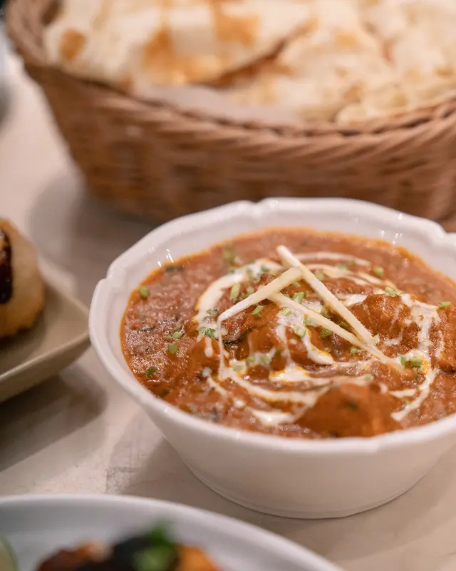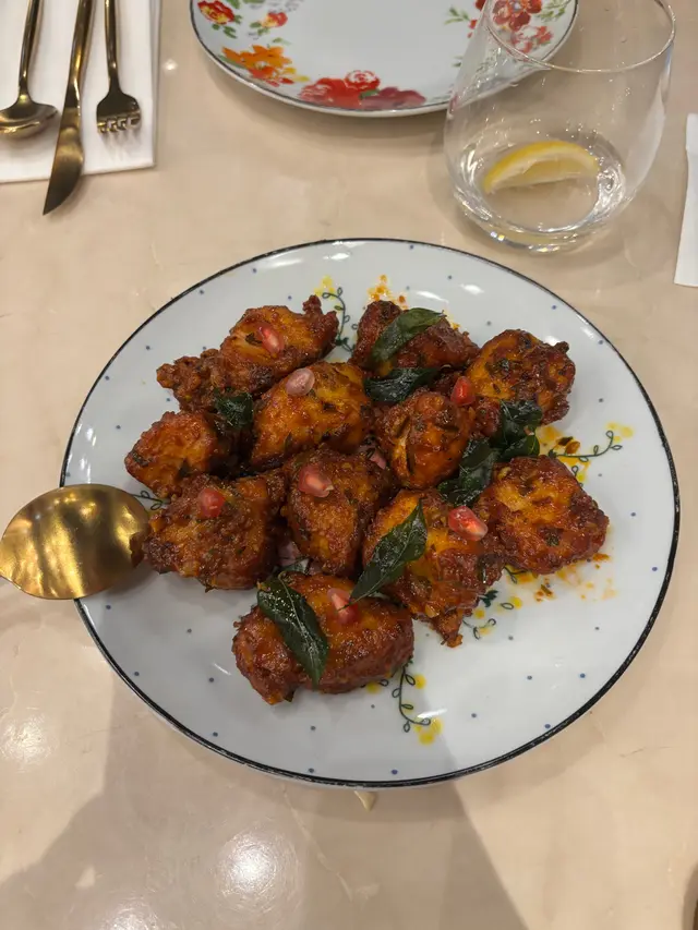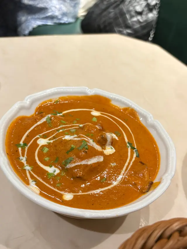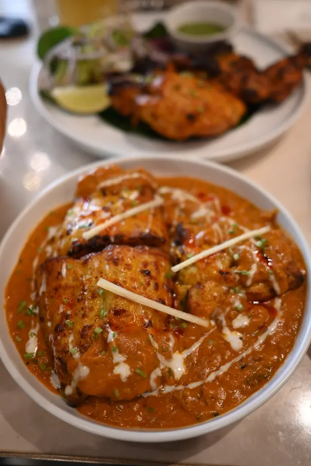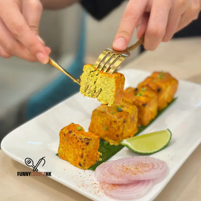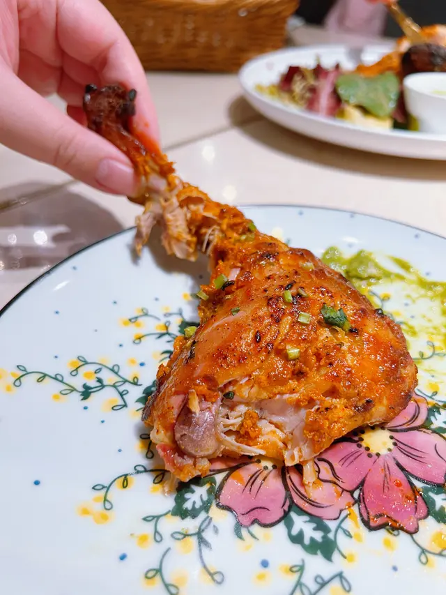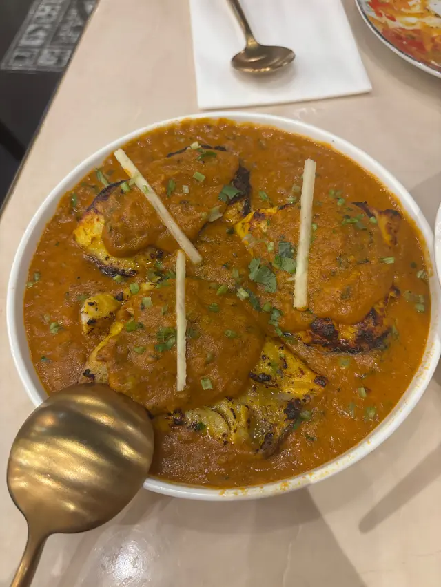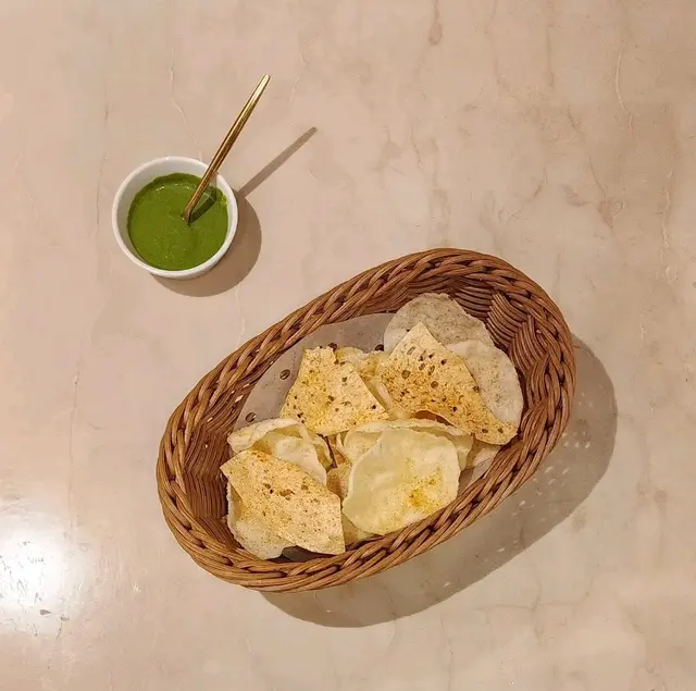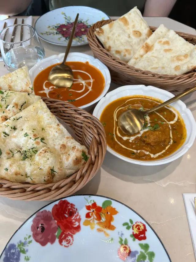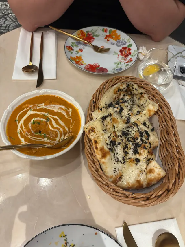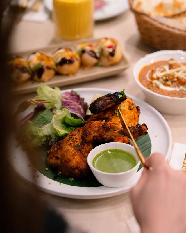 尖沙咀寶勒巷有間印度菜餐廳🇮🇳原來係由前杜拜皇室御廚主理👨🏻🍳採用天然香料代替人造色素來製作Fusion印度菜🍽️ 一到門口就已經見到色彩繽紛既手繪牆畫,入去餐廳後,藍綠色配白色,營造優雅又舒適既感覺✨今次同哥嫂來食晚餐,我地叫左:.🍗胡椒烤雞(半件)睇賣相就知用足香料去烤香,我地揀左小辣,雞皮焦香脆,內裡雞肉卻嫩滑多汁,旁伴沙律菜同薄荷乳酪!.🍱海德拉巴羊腿香飯羊腿飯係一鍋咁上,頂層有酥皮包住熔香🥧 會有專人幫你切開同撈勻,羊腿經慢煮6小時,所以肉質軟腍!香飯撈埋醬汁食幾惹味.🥘奶油雞Butter Chicken 係經典印度菜,醬汁濃郁且豐富,撈飯或叫Naan點醬食都好夾!.🥙脆餅籃裡面有兩款,一款係薄脆片,脆卜卜!另一款係自家製炸蝦片,點上旁伴的薄荷乳酪夾哂.🥭Golden Mango LassiLassi係食印度出名既招牌飲品,即芒果乳酪,口感好滑,芒果味道又香又濃郁,好飲!.🍸Masala Cutting Thai Sour呢杯係cocktail,帶點肉桂香,味道微甜,又幾ok!.見到呢度Set lunch有齊前菜、主菜、自選烤餅或香飯、甜品同飲品,仲有Vegan set,$98起就有,下次試下lunch先!…查看更多