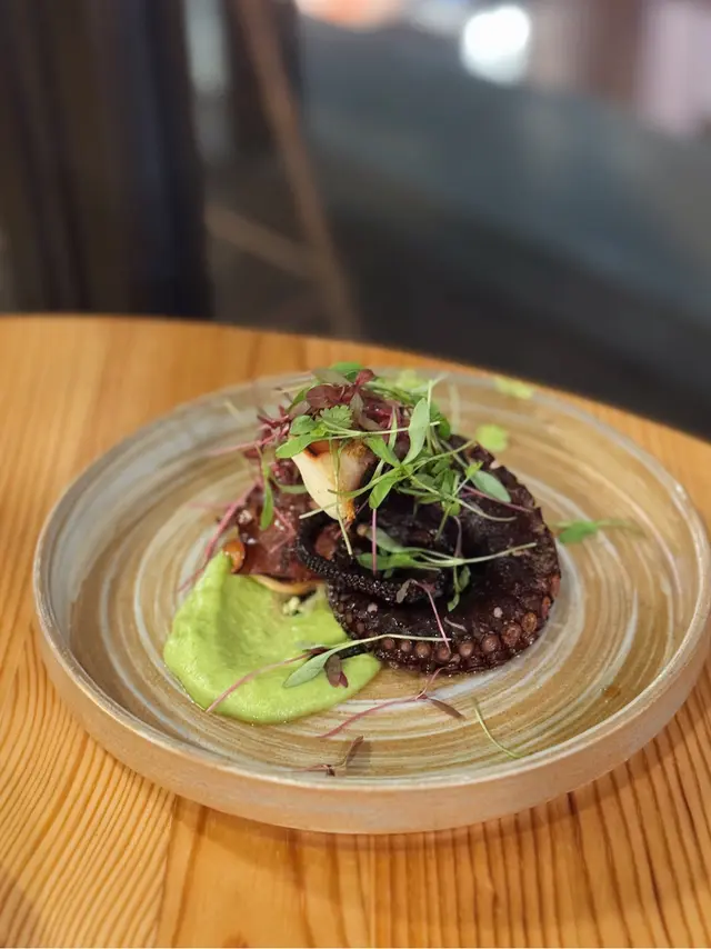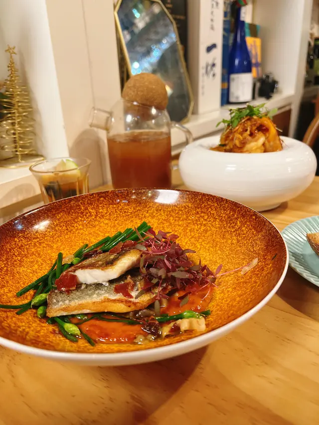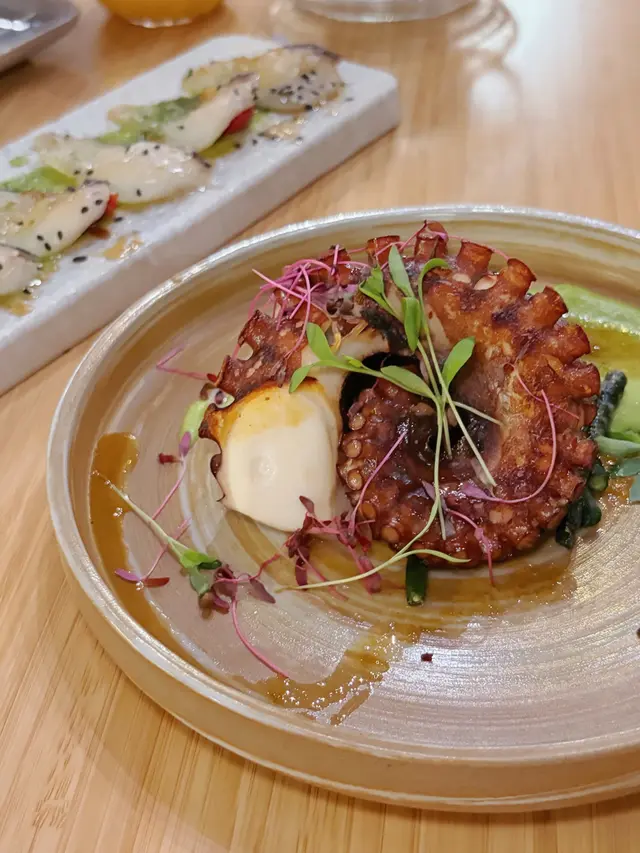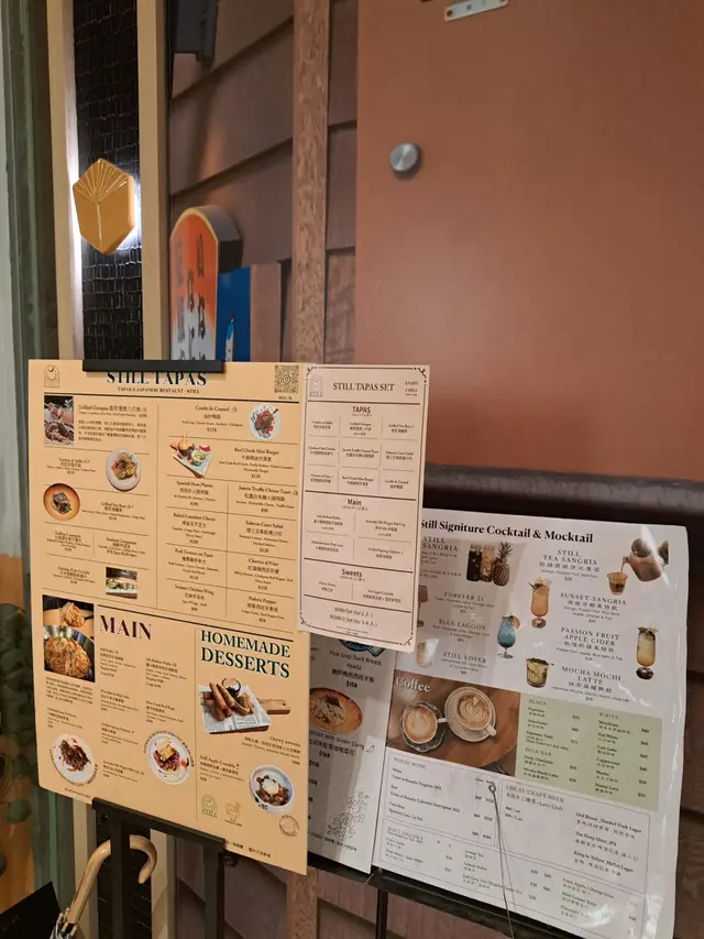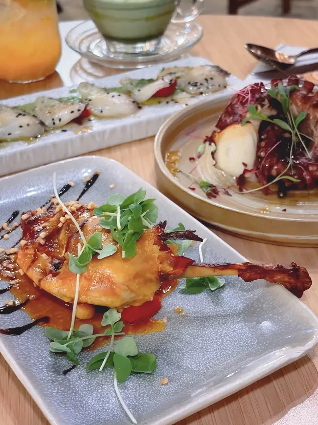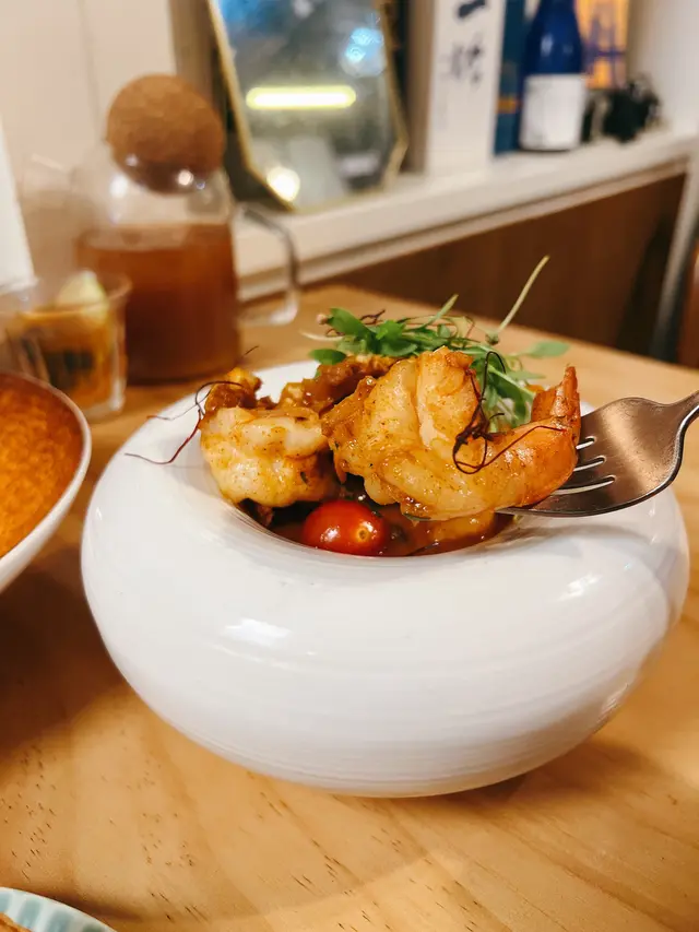 來到土瓜灣一間主打西班牙和日式fusion菜式的餐廳小店,餐廳的套餐Menu可以選全海鮮的配搭,加上而家晚市做緊85折,性價比很高,很吸引眼球。👫🍽️🇪🇸🇯🇵✨ Still Tea Sangria($58),這款特色的水果茶由芒果和熱情果調製,帶點清新也有些茶澀味,也有種解膩的感覺。🥭🍹✨ Cafe Latte($45),鮮奶咖啡口感順滑,還有靚靚的拉花。☕️🥛在2人套餐方面,包3款小食、1款主食和1款甜品,選擇多多,配搭多樣化。🦐🦑🐟🍰🌟TAPAS✨ 西班牙蒜片蝦,虎蝦混合了蒜片、蝦頭、龍蝦汁一齊熬煮,蝦肉鮮嫩多汁爽口,食到最後將蘸取底部的醬汁塗抹在麵包上,真是回味無窮。🦐🧄✨ 香煎慢煮八爪魚(+$38),八爪魚經過3小時的慢煮,粗身的八爪魚變得口感柔軟而富有彈性,完全不會過於韌硬。配以柚子胡椒醬和牛油豆蓉,為這道菜增添了層次感。🐙🔥✨ 香煎海鱸魚,外層焦香,內裡則保持了魚肉的鮮嫩。旁邊搭配的煙肉脆片增加了香脆口感,而紅咖喱醬汁底則帶來了一絲香辣與惹味。🐟🥓🌟Main✨ 墨汁鮑魚西班牙海鮮飯(+$38),大隻的鮑魚擺盤精美,令人賞心悅目。飯中加入了多種海鮮,如入口即化的左口魚、粒粒鮮香爽脆的三文魚籽、彈牙的蝦和柔軟的魷魚圈,每種食材都展現出各自的特色。此外,飯底用墨汁和魚湯熬制,不僅色澤誘人,還讓整體口感更加濕潤,簡直是出色之作。🦑🥘🖤✨ Chewy Sweets,甜品就是我喜愛的西班牙甜油條加上抹茶味的蕨餅,甜油條外脆內煙韌,外皮薄薄的塗上一層砂糖,再倒上朱古力醬,完美的配搭。而抹茶蕨餅則清新不膩,為這餐飯劃上了完美的句號。🫔🍫…查看更多