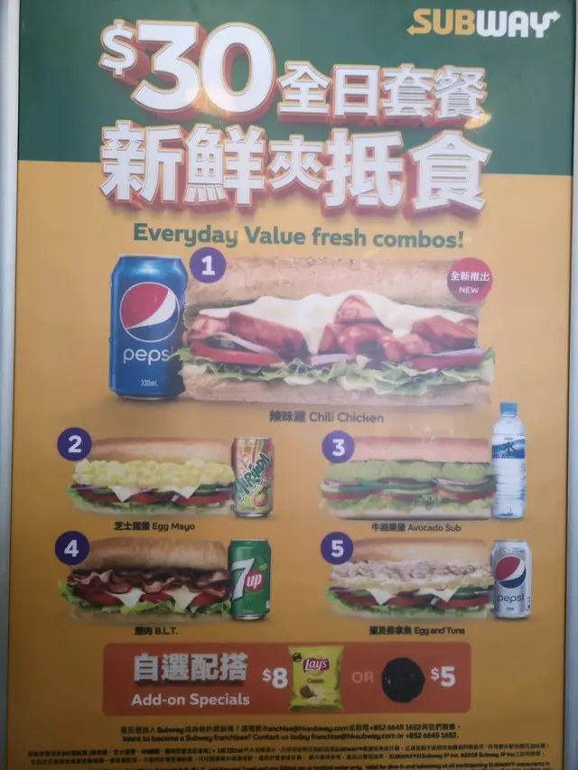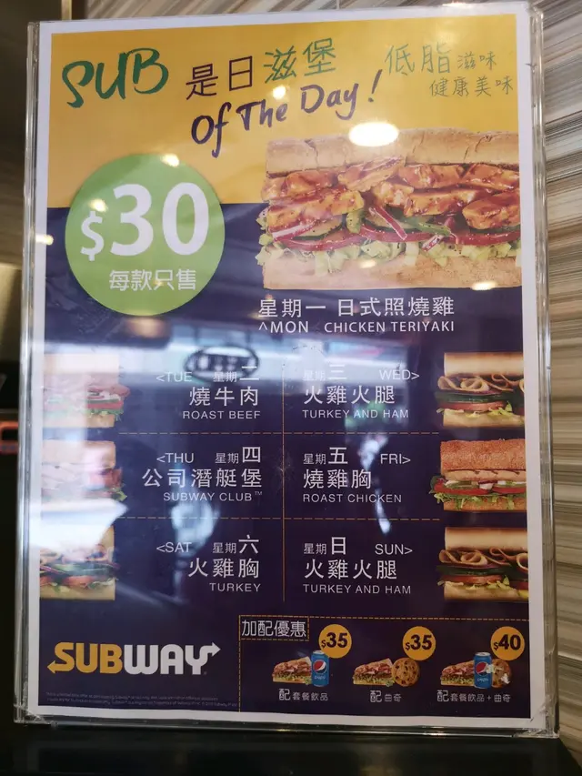 間中我都會幫襯subway架皆因快。靚。正👍我覺得subway都幾健康既😋當然睇下你點揀啦😏有特價餐,有埋飲品都係30蚊仲有另一啲款淨包30蚊👇先揀左包款先,有4款你揀我最鍾意蜜糖燕麥包😍然後講店員知你要咩款一般人都要埋芝士,好食啲又唔使加錢再揀配菜👇我次次都係要生菜、洋蔥、蕃茄、青瓜呢度仲有曲奇我就麻麻地,食過一次係軟身嗰種,我鍾意食脆既🤭打開咁既樣其實人地整既時候唔係咁😂😂我加白醋架,係咪好健康呢😆😆查看更多