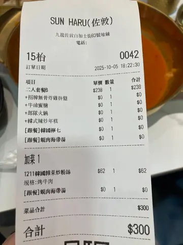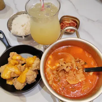 好耐冇食韓國嘢!今次喺佐敦地鐵站附近搵咗間有韓式炸雞嘅餐廳食晚餐,地方唔係好大平日七點入座幾乎滿座。餐廳提供多款一人及多人套餐可以選擇,價錢實惠。我哋叫咗二人套餐B($238)及一份肉鬆芝士蛋卷。🍽️肉鬆芝士蛋卷(四件) $38蛋卷輕盈鬆軟,蛋香味濃郁,配上芝士、茄汁、肉鬆味道更佳。相比平時大大份嘅韓式蛋卷我哋覺得呢個份量較好,唔會過量。🍽️招牌無骨炸雞拼盤(牛油蜜糖) 炸雞外皮唔會好厚重,牛油密糖口味令炸雞件甜甜哋感覺冇咁肥膩,忍唔住一啖又一啖咁食!雞件無骨,啖啖肉進食非常方便。另外炸雞旁仲有醃蘿蔔、沙律及小食(炸韓式餃子、黃金帶子、魷魚蝦枝),味道都唔錯。🍽️部隊火鍋份量頗多,除咗拉麵外配菜仲有午餐肉、腸仔、魚糕、肉等。湯底好濃郁,唔會好辣。🍽️韓式辣炒年糕年糕外仲有魚糕、泡菜、雞蛋,醬汁比部隊火鍋辣。年糕非常煙靭,唔會過熟口感唔錯。吸滿醬汁嘅魚糕亦好好食~🍹蜂蜜生薑茶 +$5生薑茶薑味濃郁但唔嗆口,同時唔會好甜,感覺非常健康養生。🍹鳳梨青檸梳打 +$8梳打飲落初時只有鳳梨味,尾調先有青檸味浮出嚟,好清新解渴。埋單$300都唔使食到好飽,抵食!…查看更多