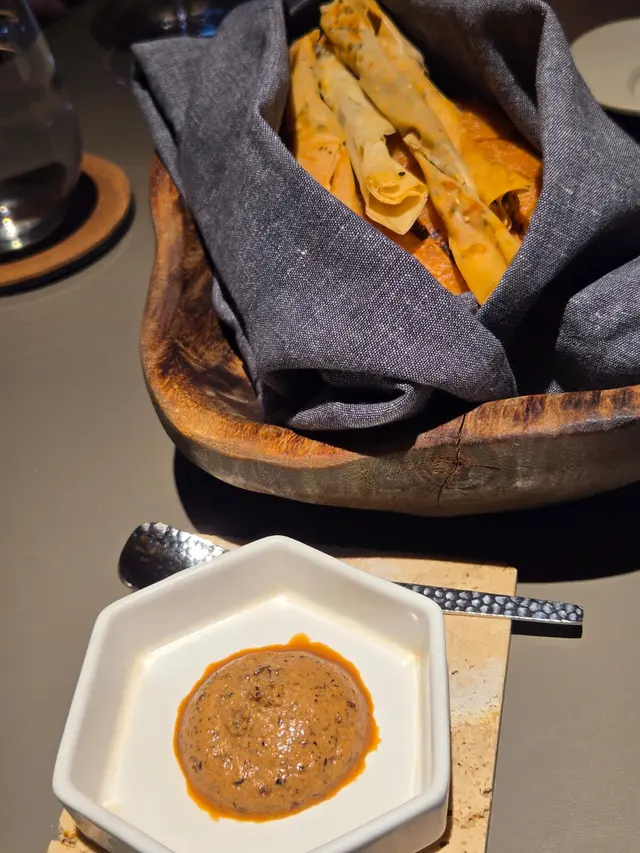 今次呢餐飯真係幾有驚喜!間餐廳坐落高層,估唔到竟然有個露天陽台,景觀開揚,坐得舒服又夠晒chill,呢一點已經即刻加分!講返食物,先讚個麵包籃,有兩款包:脆嗰款落咗香草,就咁食已經好夠味;軟身嗰款點佢哋特別嘅豆豉牛油,豆豉味突出,不過就唔算好開胃。頭盤方面,個蜆真係整得無得彈!我係蜆迷,幾種唔同蜆嘅火候都掌握得精准,保留晒佢哋本身嘅鮮味。個醬汁相信係用咗煮蜆嘅原湯做底,再加少少蒜蓉,平衡得恰到好處。另外道鴨心都好出色,煮到藍煮(Blue)嘅溫度,但一啲內臟嘅騷味都無,最後用酒送,簡直係完美收官。主菜有讚有彈。道五花腩整得幾好,脆皮之餘又keep到肉汁,好嫩滑,配嘅泡菜醬汁味道亦都啱啱好。個蝦意粉更加係驚為天人,意粉煮到Al Dente彈牙口感,蝦嘅精華全部滲咗落個醬汁度。不過,可能隻蝦嘅尺寸關係,肉質有啲過老,口感有啲遜色。至於海膽醬意粉就相對失色,意粉本身調味唔錯,但啲海膽就好似局外人咁,完全同成個菜式夾唔埋。今餐最令我印象深刻嘅,反而係一道睇落好簡單嘅煎菇!食落個口感竟然有啲似滑溜嘅炒蛋白,真係估佢唔到,係全餐最難忘嘅一道!另外道羊肉都好合我心,用高酒精酒火燎過,腌到入味入骨,連羊皮都保持到恰到好處,係我未試過嘅好滋味。最意外嘅係,我平時超憎食芫荽,但竟然接受到佢哋個芫荽沙律!胆粗粗試咗幾啖,居然完全唔使吐返出嚟,算係一個小奇蹟。唯一覺得有啲美中不足嘅,係其中一道椰菜個名令我期望過高,食落反而覺得係全餐最弱嘅一環,當然呢個可能係我個人問題啦。最後一定要讚嘅係,侍應好細心有禮,會耐心介紹菜式,換碟同斟水都好頻密,令成個用餐體驗更加完美。總括來講,呢間餐廳無論環境、食物同服務都有高水準,一定會再嚟幫襯!…查看更多