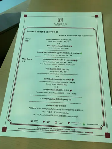 來到8月的尾聲,就讓我們抓緊夏天的尾巴,感受一下城中休閒舒適的氣息!位於灣仔香港明怡美憬閣酒店的「TANGRAM」,環境舒服溫馨,由法國行政主廚 Hubert Goussard 執掌,以現代筆觸加入香港口味,重新勾勒法式經典,愜意與精緻相融,香港活力與巴黎浪漫共融,演繹不拘一格的法式小館風情。凡於2025年9月1日至9月30日期間惠顧「晚餐套餐」,最多可享7折優惠食物:🍴 共享餐單 ($988/ 2位)🥣 西班牙青瓜凍湯,希臘乳酪,橄欖油✨源自歐洲的農家菜式,怡人的清涼感帶鮮爽,富夏日氣息,瞬間刺激味蕾和飢餓感,讓人胃口打開。🐚 布列塔尼青口,蒔蘿,白酒汁✨隻隻飽滿,鮮美彈口,沒有沙,以蒔蘿、白酒汁點綴,更能突顯其清甜可口的特性。🐮 法式傳統牛肉他他,迷你羅馬生菜✨肉質爽彈,風味濃郁,客人再隨心用叉子舀一大口,塗抹在麵包上同吃,蠻過癮。主菜 (三選二)🐟 烤挪威三文魚,茴香,椰菜✨肉質甘香鮮美,魚油脂豐富,氣息濃郁,伴以茴香、椰菜,天然溫和。🥩 烤牛柳,薯條,黑椒汁✨外皮帶微焦感,內在色澤紅潤且厚肉,擁有平均的油花,溫潤帶微嚼勁,牛肉風味與味道達至一個理想的平衡。🍮 甜品✨桃子,糖煮桃子,白朱古力慕絲,雲呢拿海綿蛋糕:脆薄的糖衣內裹有甜美的桃粒,細滑的白朱古力慕絲與微濕的雲呢拿海綿蛋糕交織,非常順喉。✨Chef Ricky 精選甜品:是日精選為清新怡人的檸檬香撻,味道酸甜十足,外脆的撻皮配搭澄黃檸檬流心餡,質感滑順濕潤,清爽治癒。…查看更多