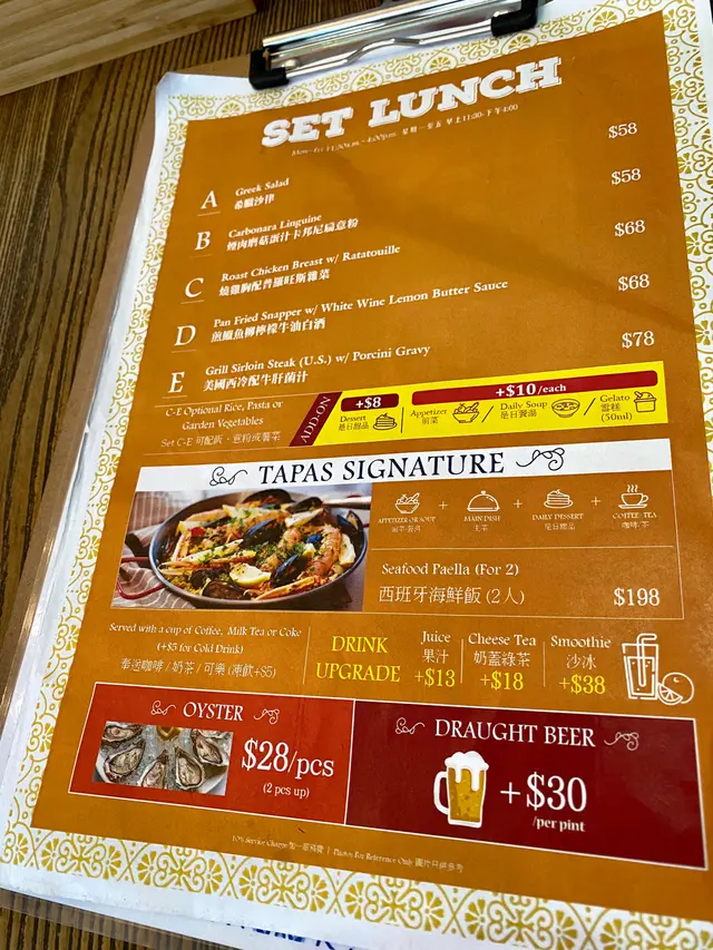 情人節前夕, Brew Tapas 都推出咗情人節套餐. 個套餐其實幾抵食, 2xx - 3xx 包咗一個餐湯,一份沙律,一份主菜,西班牙油條作為甜品以及飲品. 飲品仲可以揀紅白酒. 唔知食乜嘢,又見到個餐咁抵,純粹俾佢杯紅白酒同埋西班牙油條吸引咗,就嗌咗呢個情人節套餐.主菜方面,我哋揀咗一個西班牙海鮮炒飯同埋一個威靈頓牛柳. 威靈頓牛柳好有驚喜,火候唔錯,外邊酥皮鬆脆,入面牛柳多汁唔韌. 唯一只有少少美中不足係個酥皮有少少酥,但可以接受.反而西班牙海鮮炒飯賣相精美,有一整隻龍蝦再加10隻八隻青口喺側邊.可惜食落味道麻麻.龍蝦雖然有膏,但煮得太熟,啲肉韌而且柴,完全切唔開. 但係份量十足,男士們都一定夠飽.全餐最失望嘅係西班牙油條, 個甜品上到嚟真係O咗嘴. 西班牙油條沒有肉桂粉,亦都只有平時嘅¼粗. 雖然expect喺Mikiki呢個位食到完全正宗嘅西班牙菜,但個甜品都唔好做得咁Hea.…查看更多