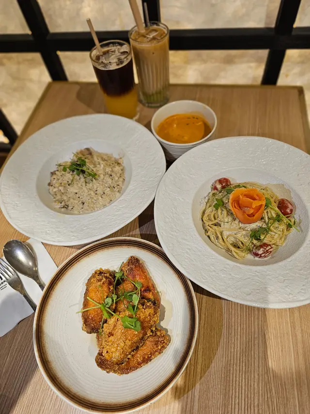 之前到訪過大圍呢間TERA分店!佢地既梳乎厘pancake真係超正✨呢排有點掛住佢地既pancake所以又再回訪了💖Cafe空間感大😍走庭園風格,有唔少綠色植物既擺設🌿🌳有小清新既氣息,喺呢度用餐可以好好放鬆一下🥰❥ 海鮮意大利飯 $178有新鮮帶子、魷魚圈同大蝦🍤😋每樣海鮮都有兩件,兩個人share唔使爭🤣帶子幾厚身,煎得好香口,食落爽甜彈牙~大蝦啖啖肉,魷魚圈令成個飯更有口感🥰意大利飯好creamy!粒粒飯都滲滿海鮮汁,口感豐富好味👍🏻❥ 安格斯牛肉漢堡配薯條🍔 $138Burger好厚身,安格斯牛肉大大份,牛味香濃,唔會煎到好老好乾身😍另外仲夾住半溶芝士、蕃茄、生菜🥬~整體味道好夾,食落juicy,口感好滿足🥰薯條份量多,夠晒熱辣香脆❤️🧡❥ 杜拜朱古力梳乎厘 + 雲尼拿雪糕🍦 $184Pancake賣相好靚😀食落好鬆軟,口感輕盈,充滿蛋香🥚朱古力味超濃郁🍫🍫🍫Pancake旁邊仲有士多啤梨、杜拜朱古力、曲奇餅碎、藍莓、開心果碎等等🫐🍪🍓口感好豐富!特別加錢叫埋雲尼拿雪糕🍦一啖pancake一啖雪糕,冷熱交融,幸福感滿滿💕❥ 香橙美式咖啡 +$40帶有清新既橙香,飲落去酸中帶苦,氣泡感十足,特別提神☕🍊❥ 草莓番石榴乳酸梳打 配草莓果乾 +$36乳酸梳打清新爽口,配上草莓果乾,口感更豐富!每一啖都係草莓既甜香🍓好解渴🥤…查看更多