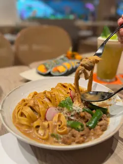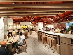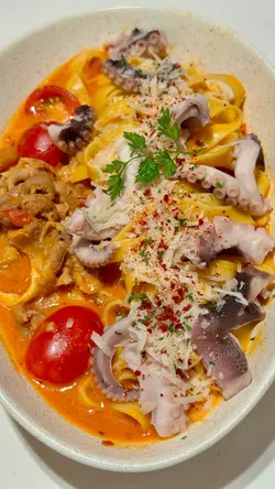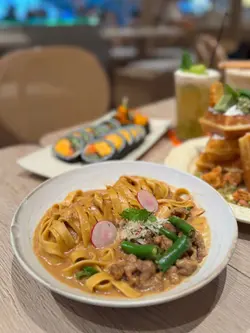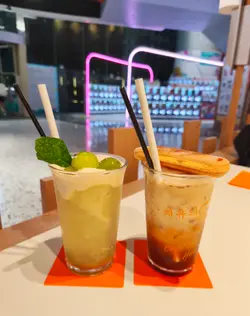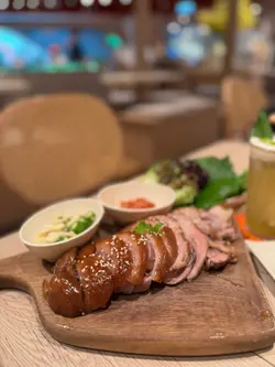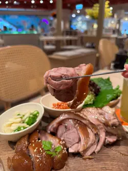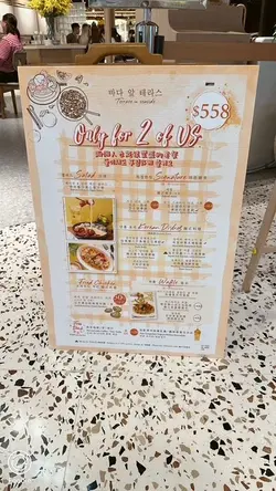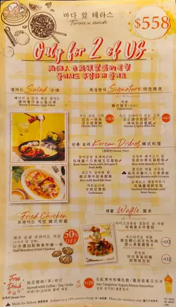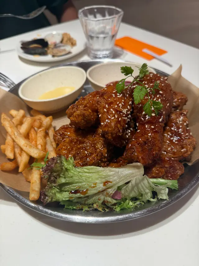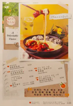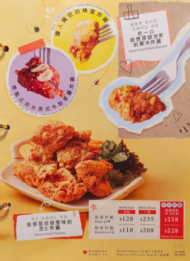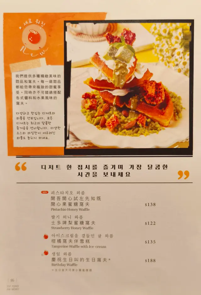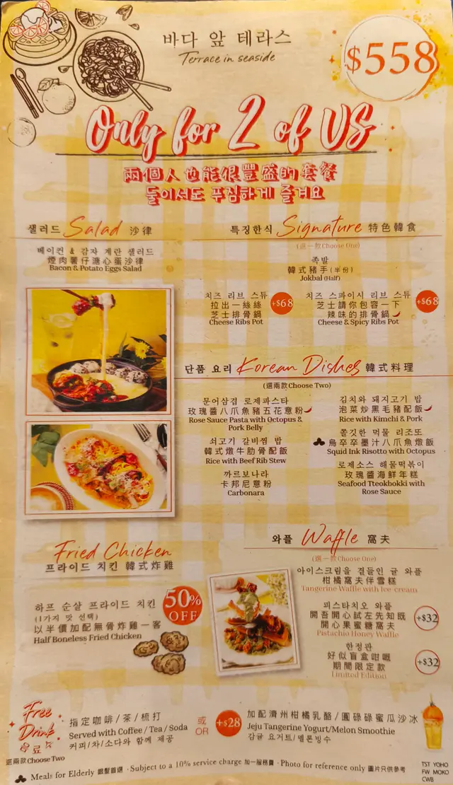 呢間韓食餐廳係商場food court位置,以橙色及木作為裝飾主題,侍應頭上帶住嘅柑橘帽好得意。有個2人餐,由沙律,主食到甜品都包埋,可以試到唔少野。前菜先有煙肉薯仔溏心蛋沙律,簡單材料但口感唔錯,唯唔係溏心蛋,偏向烚蛋。好耐無食過韓式豬手,有少少掛住,仲要唔駛另加錢。以木盤上菜,仲有生菜,韓式辣醬,青辣椒及蒜片包住食。豬手口感彈牙,包埋生菜一齊食,韓式辣醬嘅惹味都好夾豬手,亦可中和佢嘅膩感。澱粉質類要選兩款,其中之一係韓式燉牛肋骨配飯。牛肋骨與白飯份量係相同,上面再有D蛋絲,仲有紅白蘿蔔。醬汁味道係認識嘅韓式燉牛肋骨,配飯係好岩數; 肉質夠腍同入味。另一澱粉質擔當,玫瑰醬海鮮年糕,玫瑰醬係牛奶、茄汁、韓式辣醬三合一,變成淡紅色好似玫瑰色咁,味道香滑得黎有少少辛辣,掛汁程度可以令每條口感煙韌嘅年糕披上一身淡紅色上衫咁。而海鮮類就有蝦,青口及小章魚,整體味道覺得唔錯。包餐飲,都加$28轉飲濟州柑橘乳酪,呢杯絶對係呢度嘅招牌特飲,差唔多枱枱都有杯。外型吸睛,原個柑橘放係杯頂,乳酸味令人開胃,飲完仲可以食埋個柑橘,性價比高。呢客柑橘窩夫伴雪糕唔駛再另加錢,外型又係吸睛嘅。有4件窩夫,每塊都搽上忌廉,再倒少少柑橘醬汁,鬆脆又香甜口感,另有雲呢拿雪糕,橙白色配色令人感覺開心呢個二人餐份量相當對眼,3個人都絶對夠食,全部都係飽肚類,擺盤吸引,食物味道岩胃口,回頭率偏高。…查看更多