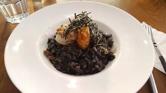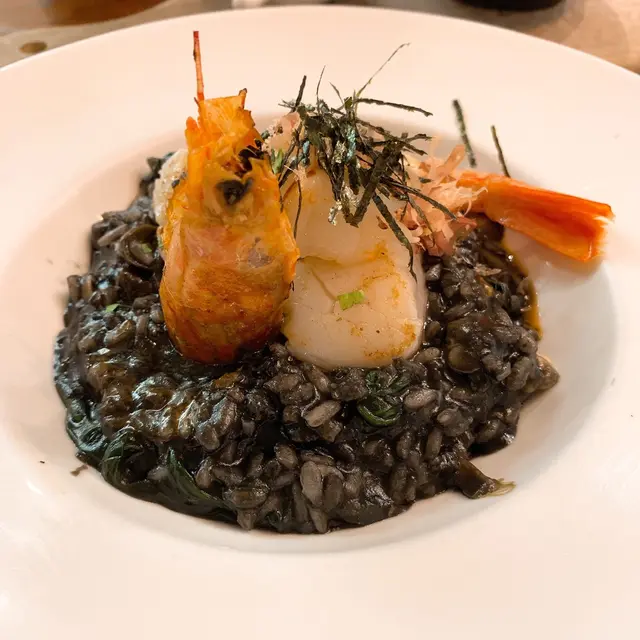 香煎天使紅蝦, 日本刺身帶子配海鮮墨魚汁意大利飯