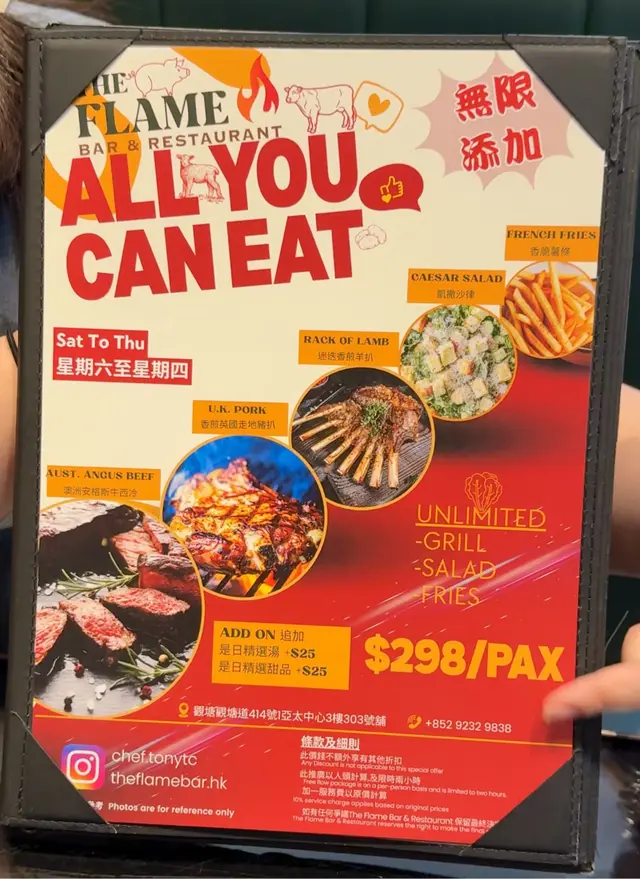 The Flame Bar & Restaurant (觀塘) 網上訂座享低至7折優惠兼賺Rice Dollars 網址: https://s.openrice.com/QrbS0MQ8B00 地址: 香港觀塘觀塘道414號1亞太中心3樓303號舖 電話: +852 92329838
