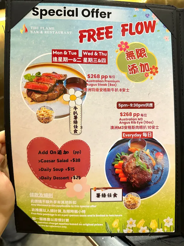 雖然自己並唔大食,但每次聽到任食牛扒薯片都會心郁郁。今晚終於可以挑戰。逢星期一至四都有任食牛扒同薯條供應。餐廳有齊室內同戶外位置,仲要寵物友善,活動包場仲有9折。澳洲特級安格斯牛扒8安士平時出去食一塊扒,可能都要呢個價,而家任你食到夠。而且牛扒唔會因為任食而比頹嘢你,如果揀五成熟,中間呈粉紅色,口感香嫩,有醬汁,出品並唔hea,第二round都冇變質。講真,食到兩round其實都賺番。薯條如果你本身鐘意食薯條,呢度係實現你嘅薯條自由,每次都係熱辣辣一桶比你,再配埋茄汁,記得問職員拎黑椒加埋仲好食。除咗又唔食牛扒薯條,可以加配沙律,湯同甜品。Caesar salad沙律都幾大碟,有煙肉乾,脆麵包,咬口豐富。Daily Soup追加餐湯只有一款,雜菜湯都比足料。Mount Fuji如果食牛扒想叫杯嘢飲,呢杯打咭夠晒吸引。富士山造型再加花既點綴,令人愛不釋手。Daily dessert朱古力慕絲蛋糕賣相吸引,濃香朱古力味。…查看更多