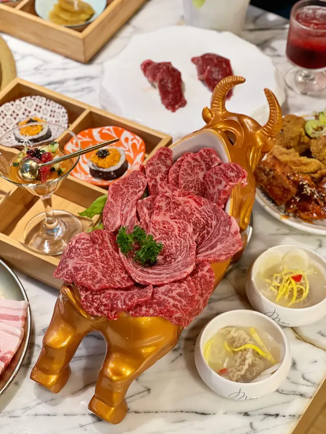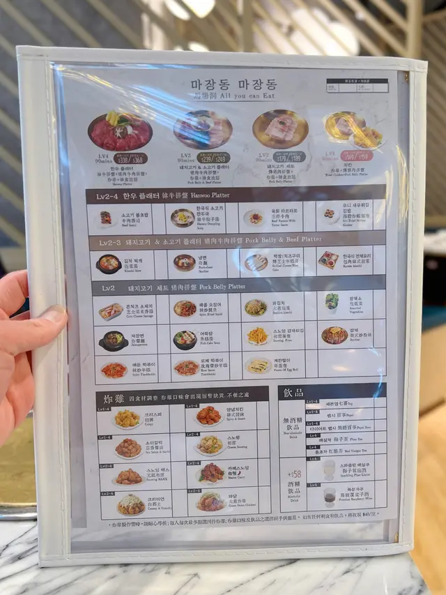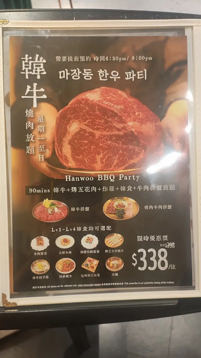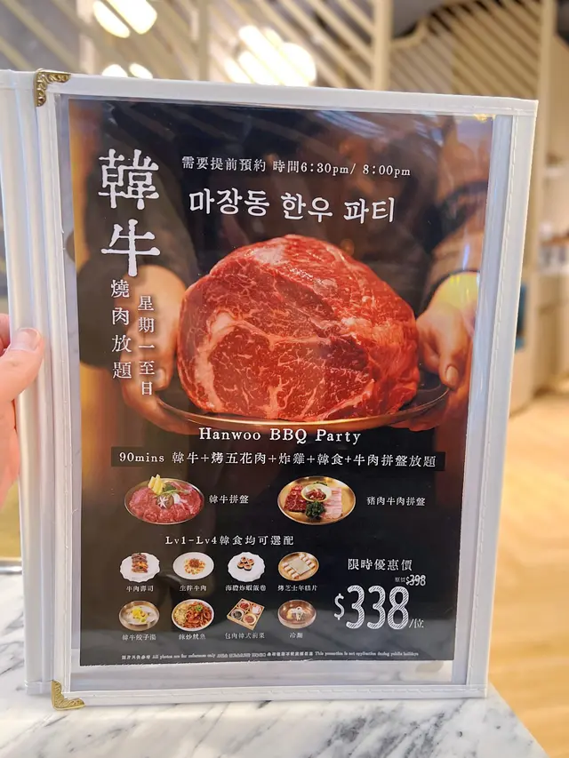 尖沙咀K11人氣韓式餐廳-The JANG最近推出左一個丈癲放題套餐!!竟然以$338呢個價錢享受到韓牛放題!! 本身韓牛出口量極稀少,所以價錢都唔平.所以$338任食絕對係香港最抵.除左韓牛外$338 Lv 4套餐仲有炸雞同各款韓食./Lv 4套餐韓牛排盤l豬肉牛肉拼盛l炸雞l韓食放題放題共有4個Lv套餐 套戲價格$149(Lv 1)-$338(Lv 4)係咁多款牛品種入面我自己最愛一定係韓牛韓牛肉質細嫩又富牛香 大理石花紋分佈平均但入口唔會過重油膩感 油脂甘香第一round仲有店員親手燒比你食除左韓牛外亦有其他同樣高質嘅豬肉牛肉拼盤韓式炸雞一共有8款口味 要食齊8款口味唔好猶豫食Lv4套餐!火雞香脆而且內裏充滿肉汁 啖啖肉超正!/韓食講得出嘅經理韓食menu內都有齊!食完燒肉當然要點返個泡菜湯同水冷麵Lv1-4入都可選配牛肉壽司。生拌牛肉。海膽炸蝦飯卷。烤年糕片。韓牛餃子湯。包肉韓式前菜。冷麵必定要點牛肉壽司!!即場火炙 熱辣辣入口充滿牛脂香氣包肉韓式前菜都推薦 配肉食減輕油膩感!!可以經續挑戰各款肉生拌牛肉醬汁酸酸甜甜好開胃…查看更多
