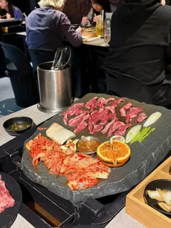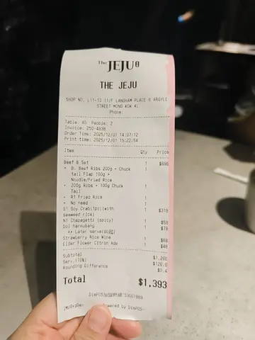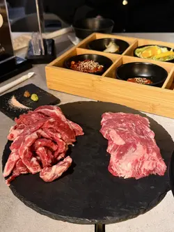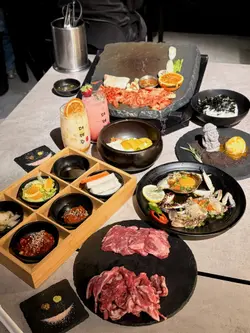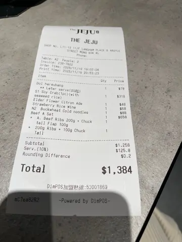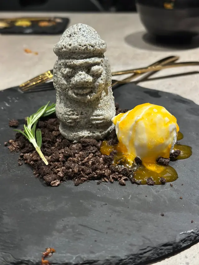 近期旺角有一間人氣大熱既濟州燒肉,超火熱又得意, 所以我都湊熱鬧立即約朋友去食~餐廳以仿傚濟州玄武岩洞穴為裝修主題,牆身是深色石材牆, 好似火山岩石般,帶點神秘及型格感覺,餐廳全部由韓國人主理,店員都是韓國人,好有feel~當晚好多人慶祝生日,店員都超high 幫手慶祝, 好好氣氛🥳餐廳用上由韓國定製的火山石烤盤嚟烤肉,受熱更加均勻,更能鎖住肉汁,餐廳烤肉工作全部由店員處理,可以安坐座位中開心吃肉肉, 超開心~🥳🌟牛肉套餐B (牛肋骨肉+牛板腱肉+炒飯)($696)每枱都會送上前菜6款,當中仲有魷魚漬,超好味。朋友想食牛肉,所以就揀咗牛肉套餐B,包括牛肋骨肉200g及牛板腱肉100g。牛肋骨肉肉味濃郁,較有口感,而牛板腱肉則較軟淋,2款都好唔錯。套餐仲可以選炒飯或炸醬拉麵,我地就揀咗炒飯,經過火山石烤盤炒過,再加上芝士及煎蛋,炒飯口感更豐富,亦更惹味。 燒烤的配菜都好豐富,包括泡菜,雞髀菇及濟州柑橘,特別一讚濟州柑橘,烤過的濟州柑橘清甜無渣,食烤肉時解膩一流💫🌟醬油蟹($318)見到有醬油蟹,忍唔住叫咗一隻。醬油蟹好多蟹膏,再加上淡淡的醬油香,不會死鹹,鮮味好食,配上紫菜飯同吃,真係超正!🌟甜品:Jeju Yeah Yeah ($70)最後當然要食埋甜品先完滿啦,濟州島石爺做型的芝麻奶凍,可愛又香濃,內裏仲包住蜜柑,帶水果香甜,配上Oreo碎及雲呢拿雪糕,味道唔錯👍🏻🌟飲品:士多啤梨米酒|哈拉邦米酒 ($68@)好鍾意韓國的米酒, 米味香甜, 酒味又不會太濃, 所以點了2杯水果口味的米酒,哈拉邦即是濟州的橘子, 加入米酒裏, 清爽清甜, 而士多啤梨米酒則多了一份香甜, 2款都很不錯😋…查看更多