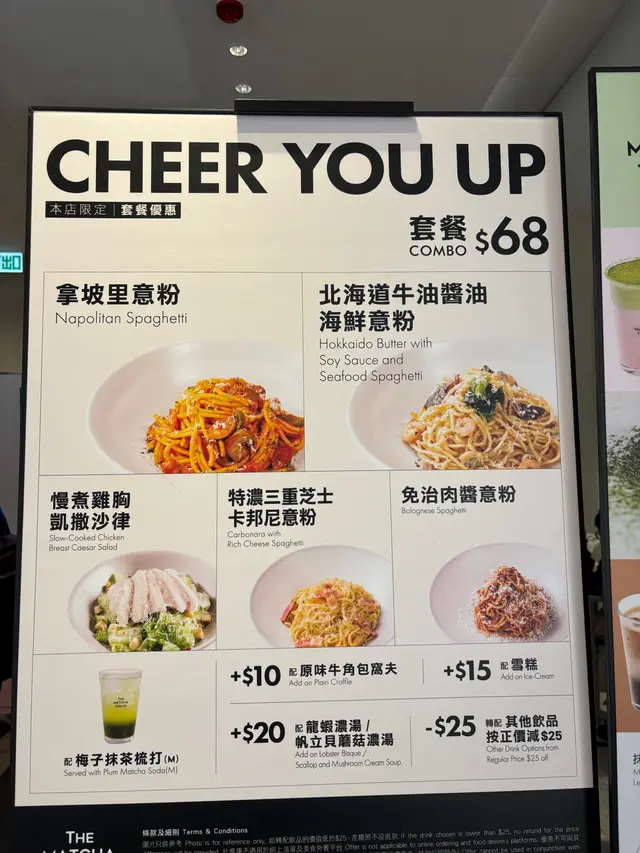 🍝拿坡里意粉基本款意粉,茄汁味的意粉是經典口味,加上少量腸仔做配搭,意粉煮得剛好,個人喜歡偏硬一點的口感。🍝免治肉醬意粉肉醬濃郁,收汁後比較乾身,肉醬平均沾滿麵條,更好吃了。🍝卡邦尼意粉醬汁濃厚,意粉掛滿醬汁,簡單好吃。🍝北海道奶油海鮮意粉4款意粉中這個味道是最溫和好吃的,奶油味和海鮮蜆相配,不會很膩。🍵焙茶鮮奶(太加奶)少見的焙茶鮮奶,也是第一次認識太加奶,是植物奶的一種,味道像豆奶,口感比鮮奶薄,比較輕盈。