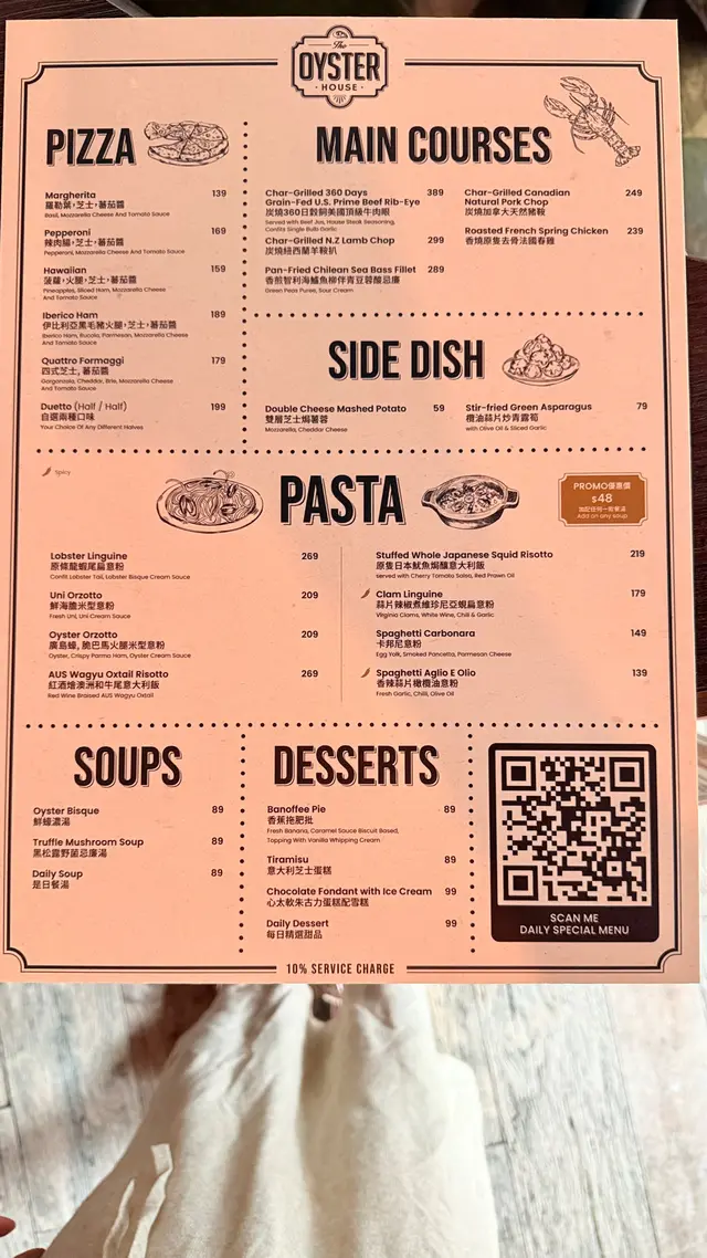 ,以大類以言,仲有海鮮拼盤、廚師推介、前菜、薄餅、意大利麵、主菜、湯品、甜品……等等。而飲品方面,食蠔嘅自不然唔少得紅白餐酒,仲有啤酒、雞尾酒、威士忌,以及好些非酒精飲品。