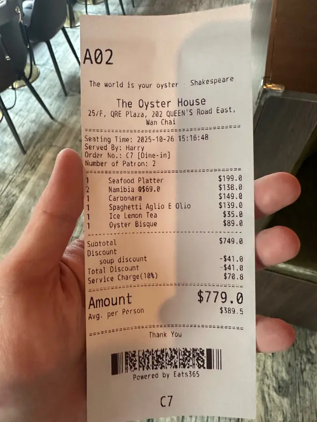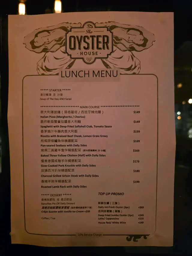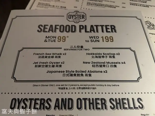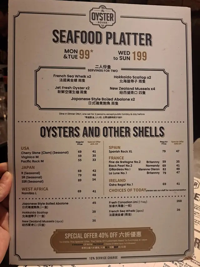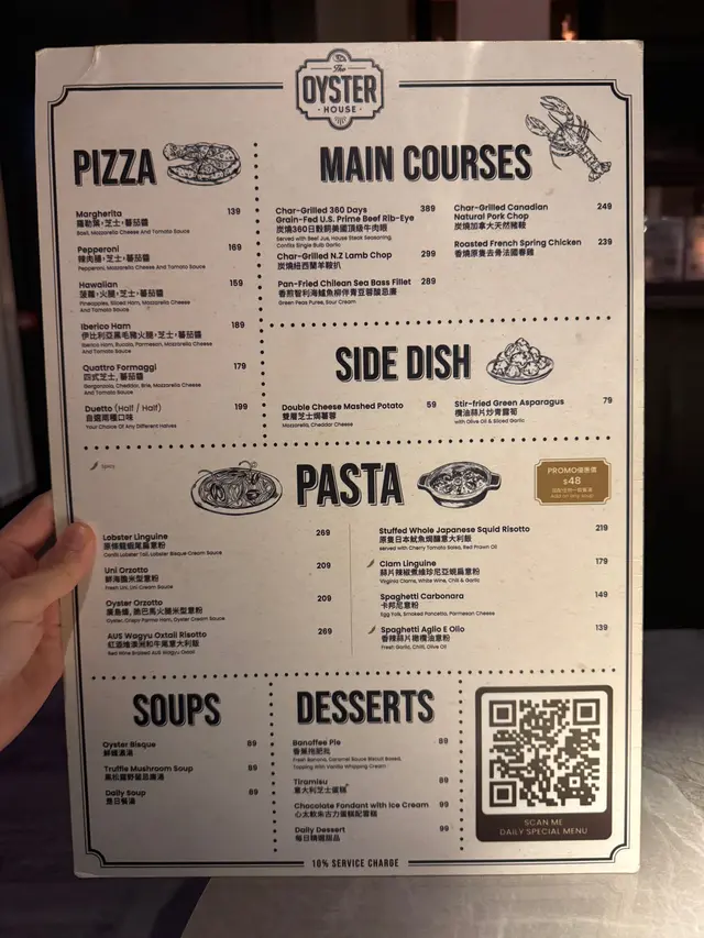 The Oyster House 📍灣仔皇后大道東202號QRE Plaza 25樓 去左灣仔一棟食肆林立既QRE Plaza食意大利西餐🍴🍽️ ,主打食生蠔🦪,多款不同國家既生蠔選擇,品嚐意大利菜也不能錯過! 當然點了Seafood Platter 原來餐廳每逢星期一及二都可以優惠價$99就可以試到一set,好高性價比真係每枱都會點! 💫海鮮拼盤 - 有5款海鮮包括有,法國黃金螺x2、北海道帶子x2、新鮮直送生蠔x2、紐西蘭青口x4 同埋日本磯煮鮑魚x2,海鮮係有質素新鮮鮮甜重海水味。✴️ 💫鮮蠔濃湯 - 呢個湯🥣必點亦唔係度度有,濃郁嘅生蠔鮮味融入湯中,質感順滑味道極豐富,湯中大大隻蠔肉🦪令濃湯富有層次感。 💫烤牛骨髓伴和牛肉眼粒配法包多士 - 大大條牛骨滿载好多和牛肉眼粒同洋蔥,一下一下🍴將邪惡既牛骨髓刮出嚟,放係脆脆既法包多士上面,一入口滿滿油脂香,真心好食回味無窮。💫 💫Margherita pizza 🍕 - 羅勒葉、芝士、蕃茄醬既pizza 好好食,薄餅底脆口充滿酸酸甜甜。 💫蟹肉牛油果醬🥑塔配黑魚子 - 牛油果醬綿密香濃,鮮甜蟹肉🦀浸出海水味,黑魚子鹹香點綴,口感豐富又有驚喜💥,藝術品的享受。 最後甜品Tiramisu🍯完美收尾,好滑咖啡酒味香濃,幸福❤️既味道。 整體來說,The Oyster House🍽好適合放鬆聊天及慶祝的好地方,不但食物水準高,環境浪漫。記住星期一、二來食海鮮拼盤,真係好抵食又好味。💯…查看更多