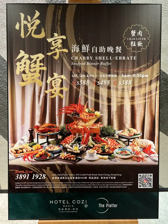 位於悦品酒店.荃灣嘅🌟The Platter🌟,每逢週末晚市,都會有主打蟹料理嘅自助餐🦀!晚市自助餐🍴由6pm開始,食足210分鐘🥳!早到嘅話,可以上UG嘅💐Grazzi Garden行下,空中花園佈置得幾靚✨,可以影個靚相打下卡📸!🦀悅享蟹宴.海鮮自助晚餐 $588/位逢星期六日及公眾假期供應,主打蟹肉料理及海鮮嘅自助晚餐!喺官網同埋嘅其他訂購網站,都會有限時優惠,低至五折!🦀蟹料理凍海鮮區有鱈場蟹腳、花蟹,冷盤區有蟹肉帶子鮮果沙律,熱葷區有薑葱炒蟹、鵝肝蟹肉炒飯、蟹耔蟹肉扒翡翠等,連蟹黃海鮮蟹粥都有,滿足晒唔同年齡層嘅需要!🦪刺身及海鮮料理喺你面前即開嘅生蠔係無限任食!刺身區有三文魚、阿根廷赤蝦、馬刀貝等!熟食就有即叫即製嘅焗芝士波士頓龍蝦、白蝦、藍青口、翡翠螺、爐端燒鮑魚等!🥩扒類燒原條穀飼肉眼扒及燒羊鞍,羊鞍都幾嫩口,又夠肥美!🍨甜品Häagen Dazs雪糕任食!仲可以自製窩夫,同埋玩朱古力噴泉!多款西餅蛋糕及新鮮生果同時供應!🍺飲品包埋無限任飲啤酒汽水果汁咖啡,不另收費!…查看更多