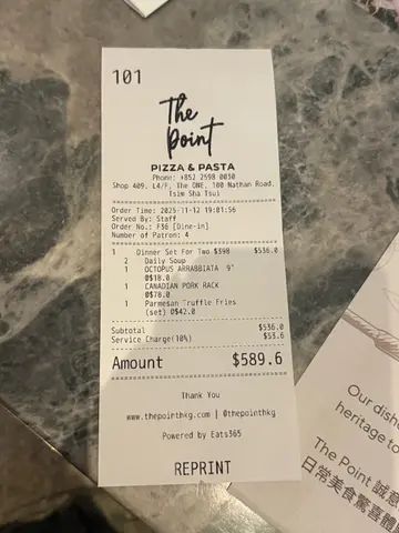 The Point - Pizza & Pasta (The ONE) (尖沙咀) 網上訂座即賺Rice Dollars 網址: https://s.openrice.com/QrbS0aey3W0 地址: 香港尖沙咀彌敦道100號The ONE 4樓L409號舖 電話: +852 25980030