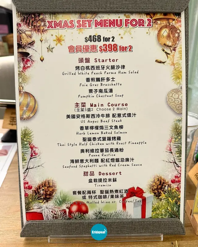 THE PONT (旺角)臨時約嘅飯局所以就無book餐廳要即時搵今次搵咗位於朗豪坊嘅The Pont老實個位有少少隱蔽所以餐廳客人都唔太多本身餐廳以花草簡潔為主聖誕期間加上聖誕佈置就有更多打卡位啦座位算闊落加上唔多人坐低傾吓偈係幾舒服但唔好對食物有太多期望🫣X’mas Set for 2 $468/2人烤白桃西班牙火腿沙律-正正常常香煎鵝肝多士-鵝肝多士份量剛好,帶微辣栗子南瓜湯-湯入面有1-2粒栗子 但南瓜湯嚟講算偏淡味美國安格斯西冷牛扒配意式濃汁-正所謂期望愈大失望愈大?! 食落去普普通通聖誕泰式菠蘿烤雞-烤雞反而唔錯 皮脆肉嫩 菠蘿亦燒到剛好 但聖誕嘅位喺邊😂盆栽提拉米蘇-個人覺得呢個提拉米蘇係完全fail 唔知係咪個盆栽用咗曲奇加朱古力去做 驚佢會溶定其他原因 手指餅完全無浸到咖啡酒之類 然後本身中和酒味手指餅嘅喺cheese已經唔太濃味 再加埋乾身嘅手指餅 成個感覺唔似食梗Tiramisu接骨木花特濃咖啡-有微微嘅酸味 朋友話係杯唔錯嘅啡聖誕熱煮紅酒-朋友點嘅THE PONT (旺角)旺角亞皆老街8號朗豪坊2樓32,33及35-37號舖…查看更多