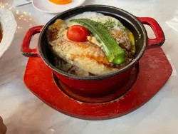琺瑯鍋.香煎魚柳.山葵芥末籽蜜糖忌廉汁.温泉蛋.紅糙米飯