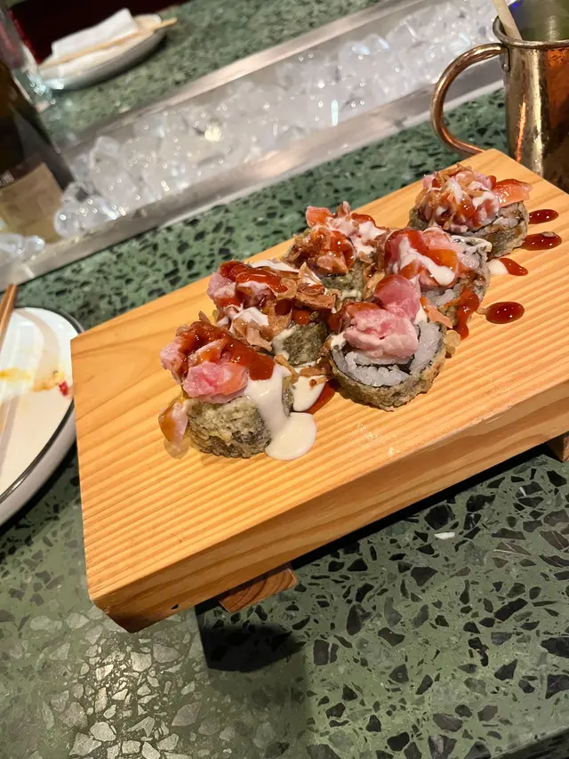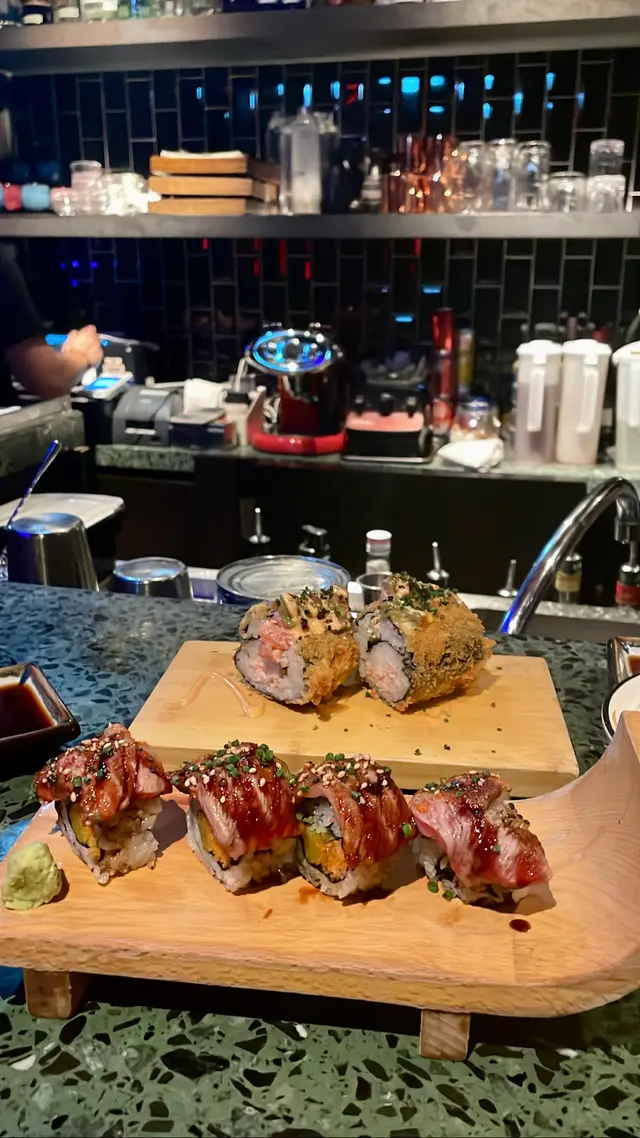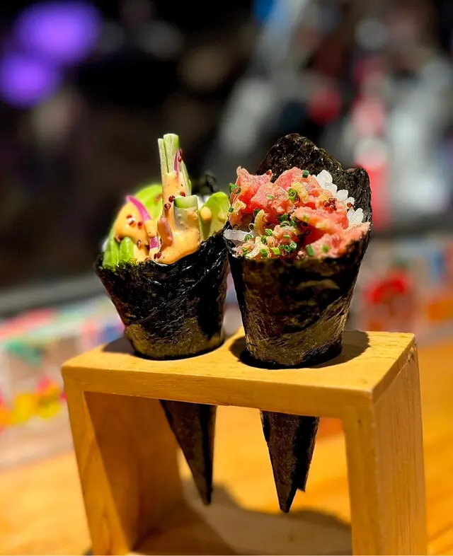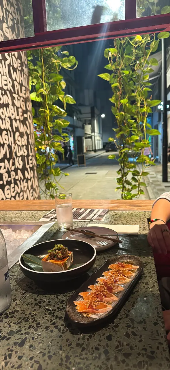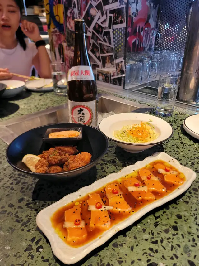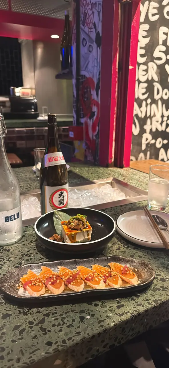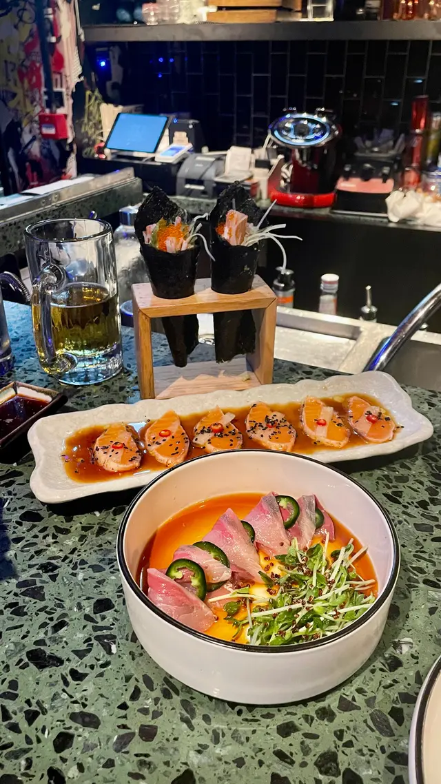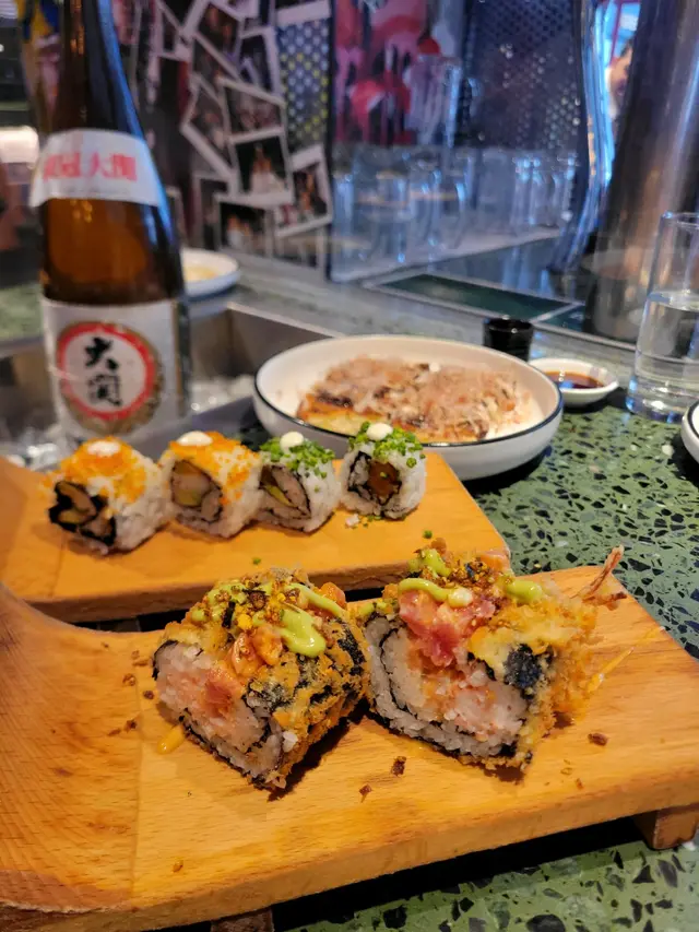 Quietly hidden away in Wan Chai's moon street, this spot was a quick walk from Exit F from the Admiralty Station. I was quickly enraptured by the odd clash of nightclub-like lighting, the wall of stereos, and the neon lights. The internal design of the restaurant was quite an interesting take on Japanese and Western fusion; the dim lanterns that hovered above; the walls of newspaper scraps and spray painted pop art; the rivers of ice that held up premium bottles of wine (which somehow provided decent air conditioning against the hk summer). Visually, I was beyond impressed. Would definitely recommend this place for a small group of your closest pals.As we seated, we were greeted with lovely staff; Our server took great kindness and patience teaching us the ingredients in each dish, what serving sizes were to be expected, and the most popular dishes they were known for. As a customer, I felt easily cozy and relaxed as I took in the classy and elegant atmosphere.Likewise, the food that came after did not disappoint. For a table of 2, we were recommended to order a snack, a tataki, and two maki rolls. Firstly the Hiyayakko; I will never forget the smoothness of the tofu which complemented greatly with the heavenly seasoned soy glazed mushrooms. Never knew soy sauce could be paired with tofu so well. Next the salmon tataki; Meh, I usually love salmon but I didn't enjoy how the edges were seared. Definitely could've tasted better completely raw in my opinion. What blew me away, was the Curry Crab Crunch and the T-dragon, both amazing choices that combined the soft vinegary rice with a fried crunch of crab/shrimp. The Curry Mayo on top was quite a nice visual touch too.However, all my joys fell through as soon as I saw the bill, almost $600 dollars. To be fair, I shouldn't be too surprised since this place was located between Wan Chai and Admiralty, but MAN did I feel broke. I wish amazing quality restaurants stopped forcing their customers to pay $45 just for a drink of water, while the 10% service charge was just as nasty too. Specifically, I wish we gotten more portions if we were to pay that much. On another note, I also heard from my friends who tried their Dai Ninki Setto set, and were just as disappointed with the prices. They had to pay like $300 per person (it was his birthday), and had to share ONE BOWL OF UDON between the three of them. I can understand sharing the appetizers, but expecting three dudes to share the same small bowl of noodles is kinda wild. But hey, I haven't ordered this set yet, so please read this with a grain of salt.Overall, amazing unforgettable food that you can rely on for special occasions between 2-4 people, but please order a la carte instead of the set I guess haha.…查看更多