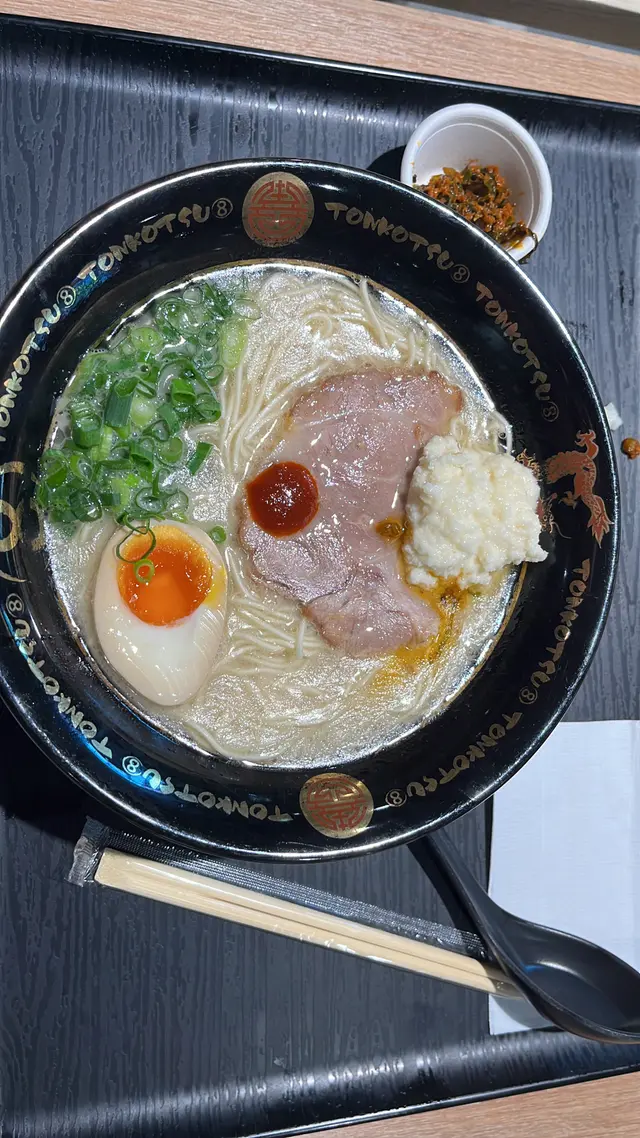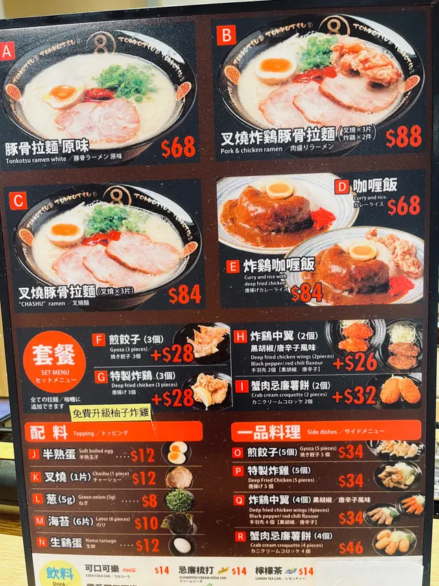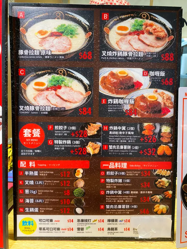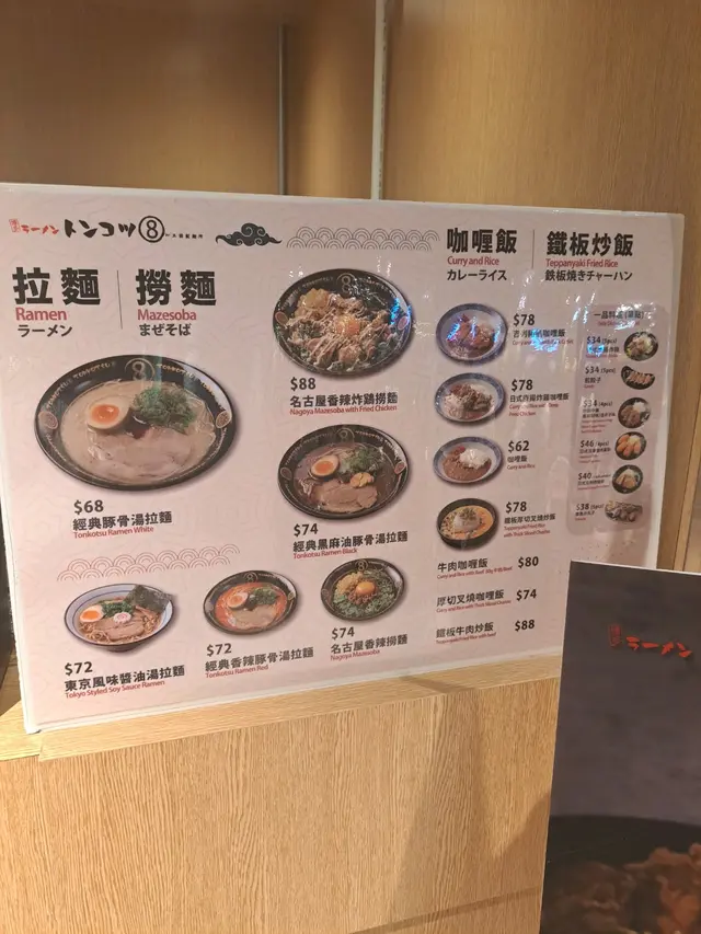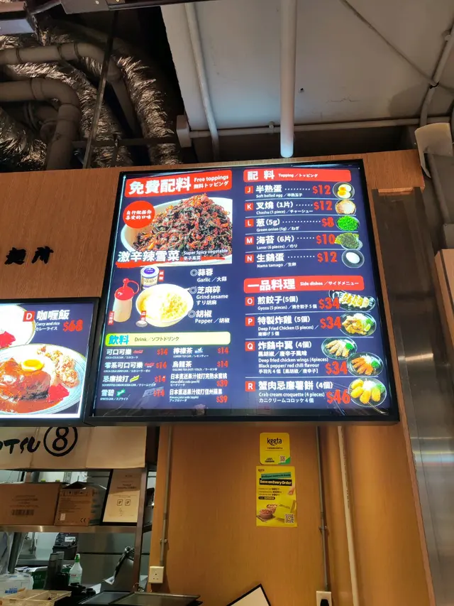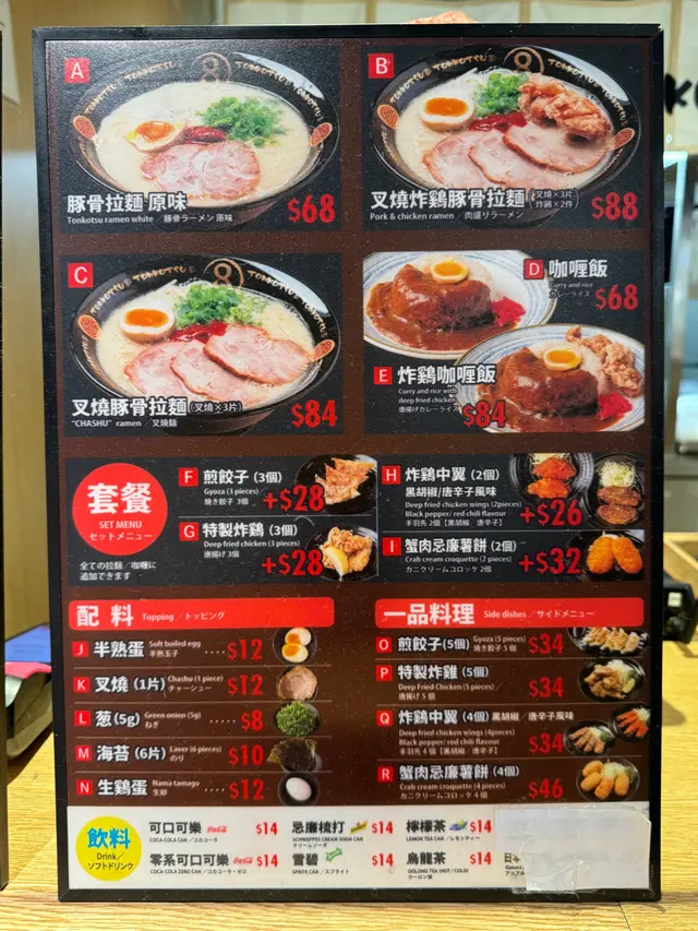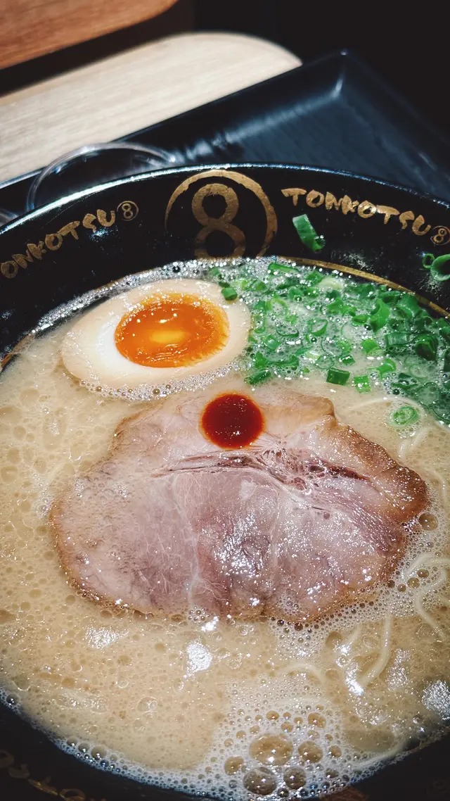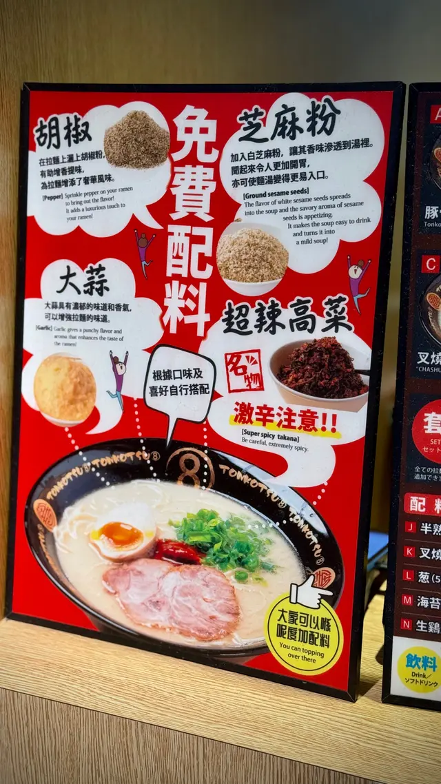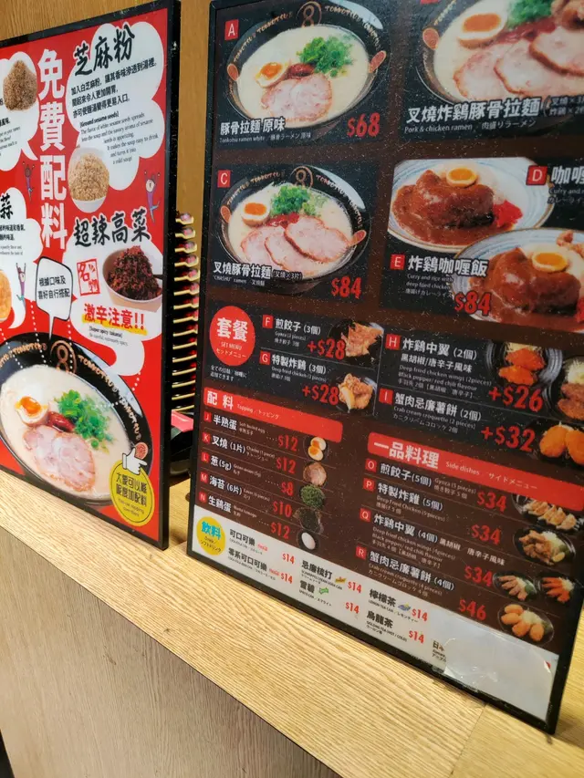 位於太古美食廣場的日式拉麵店,旁邊還有其他美食站可供客人自由選擇。這間小店主要供應豚骨湯底拉麵,還有咖喱飯,間中也與推出期間限定款式。下單後,在附近找個位置坐下,當食物準備好,手上的提示器就會震動。豚骨拉麵 最基本的原味拉麵,有叉燒同半熟蛋。根據口味,自行配搭調味,有胡椒、大蒜、芝麻粉、超辣高菜。另外可以額外加點配料,如半熟蛋、叉燒、蔥花等等。半熟蛋溏心狀態,恰好。高菜鹹香辣,越吃越辣越過癮。叉燒豚骨拉麵一共有三片叉燒,湯頭濃稠醇厚, 帶點油脂。配搭細直麵條,幼身掛湯,而且蠻有口感。叉燒薄切,肥瘦均勻,口感柔嫩。另外飲料點了一杯烏龍茶,解渴解膩。…查看更多