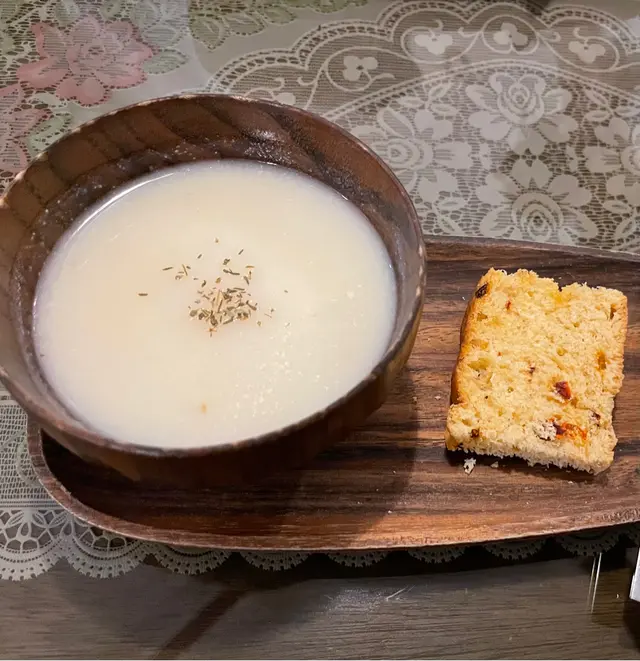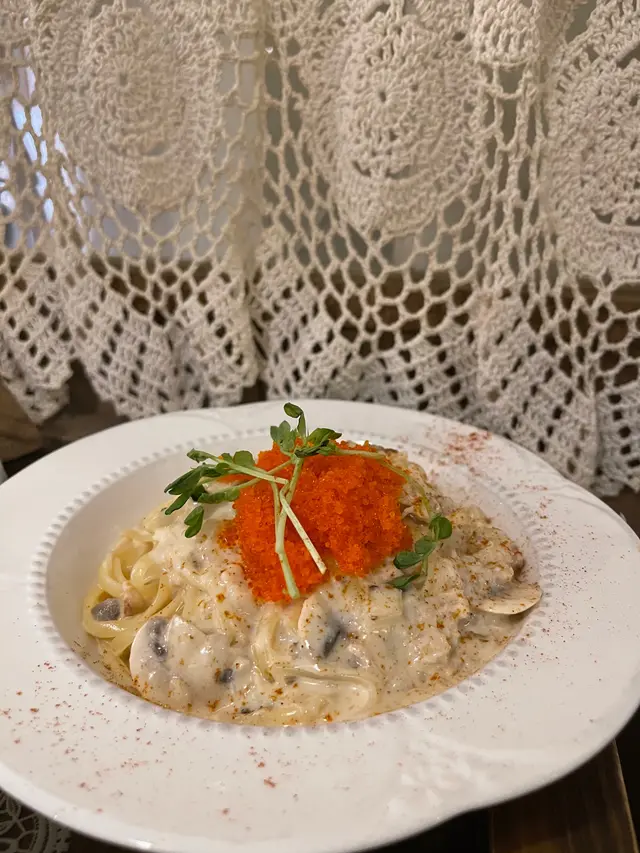 Cafe嘅佈置偏向文青同日式嘅風格🎎而坐位就唔係好多🪑想食嘅話盡量早d到🙌🏻但都坐得嘅舒服嘅🙆🏻♀️🔺前菜🫕(湯加包)唔記得咗係咩湯🥺但記得個人唔太鍾意🤭覺得有少少水🥴包🍞係莓嘅包,不過不失💁🏻♀️🔺鹹蛋黃醬帶子意大利粉🍝$88好奇加上本身鐘意鹹蛋黃就想試吓😗配料有4粒帶子同頗多蘆筍🥬但鹹蛋黃醬加意粉講真個人覺得有d奇怪🥴有少少唔太夾😶食一兩啖都ok但食多幾啖就真係麻麻啦😌
